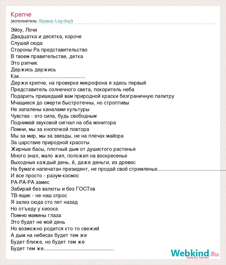 Эйоу, Лочи Двадцатка и десятка, короче Слушай сюда Стороны Ра представительство В твоем правительстве, детка Это рэпчик Держись держись Как........................................... Держи крепче, на проверке микрофона я здесь первый Представитель солнечного света, покоритель неба Подарить пришедший вам природной краски безграничную палитру Мчащиеся до смерти быстротечны, но строптивы Не запалены каналами культуры Чувства - это сила, будь свободным Поднимай звуковой сигнал на оба монитора Помни, мы за кнопочкой повтора Мы за мир, мы за звезды, не на плечах майора За царствие природной красоты Жирные басы, плотный дым от душистого растенья Много знал, мало жил, положил на воскресенье Выходные каждый день, ё, даже деньги, из древес На бумаге напечатан президент, не продай своё стремленье............................................. И все просто - разум-космос РА-РА-РА замес Забирай без валюты и без ГОСТов ТВ-ящик - не наш спрос Я залез сюда сто лет назад Но отъеду у киоска Помню мамины глаза Это будет не мой день Но возможно родится кто то свежий А дым на небесах будет тем же Будет ближе, но будет тем же Будет тем же..............................................