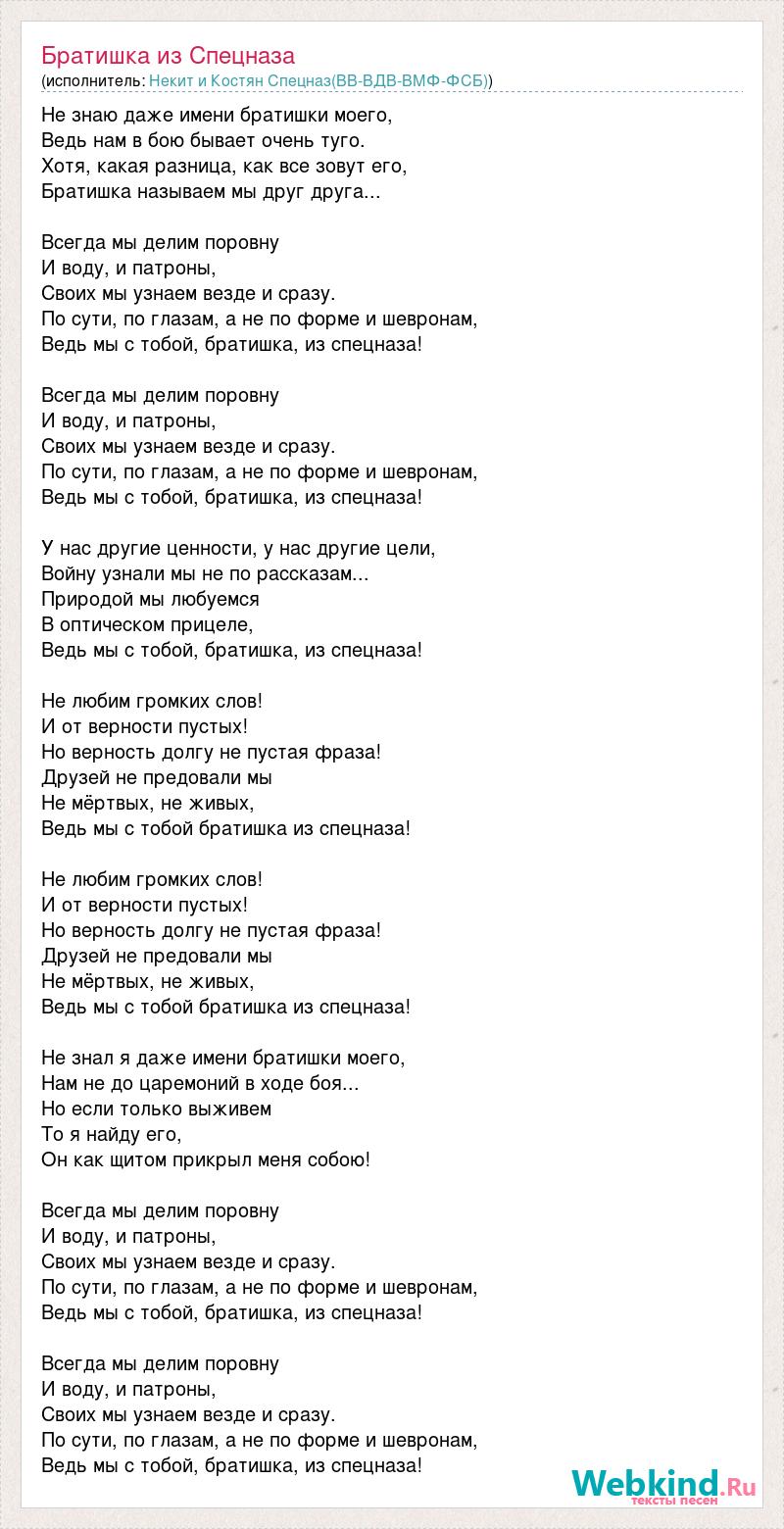 Не знаю даже имени братишки моего, Ведь нам в бою бывает очень туго. Хотя, какая разница, как все зовут его, Братишка называем мы друг друга... Всегда мы делим поровну И воду, и патроны, Своих мы узнаем везде и сразу. По сути, по глазам, а не по форме и шевронам, Ведь мы с тобой, братишка, из спецназа! Всегда мы делим поровну И воду, и патроны, Своих мы узнаем везде и сразу. По сути, по глазам, а не по форме и шевронам, Ведь мы с тобой, братишка, из спецназа! У нас другие ценности, у нас другие цели, Войну узнали мы не по рассказам... Природой мы любуемся В оптическом прицеле, Ведь мы с тобой, братишка, из спецназа! Не любим громких слов! И от верности пустых! Но верность долгу не пустая фраза! Друзей не предовали мы Не мёртвых, не живых, Ведь мы с тобой братишка из спецназа! Не любим громких слов! И от верности пустых! Но верность долгу не пустая фраза! Друзей не предовали мы Не мёртвых, не живых, Ведь мы с тобой братишка из спецназа! Не знал я даже имени братишки моего, Нам не до царемоний в ходе боя... Но если только выживем То я найду его, Он как щитом прикрыл меня собою! Всегда мы делим поровну И воду, и патроны, Своих мы узнаем везде и сразу. По сути, по глазам, а не по форме и шевронам, Ведь мы с тобой, братишка, из спецназа! Всегда мы делим поровну И воду, и патроны, Своих мы узнаем везде и сразу. По сути, по глазам, а не по форме и шевронам, Ведь мы с тобой, братишка, из спецназа!
