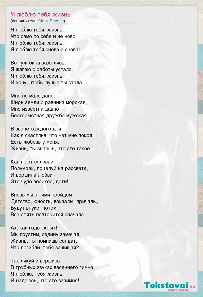 Я люблю тебя, жизнь, Что само по себе и не ново. Я люблю тебя, жизнь, Я люблю тебя снова и снова! Вот уж окна зажглись, Я шагаю с работы устало. Я люблю тебя, жизнь, И хочу, чтобы лучше ты стала. Мне не мало дано: Ширь земли и равнина морская, Мне известна давно Бескорыстная дружба мужская. В звоне каждого дня Как я счастлив, что нет мне покоя! Есть любовь у меня. Жизнь, ты знаешь, что это такое... Как поют соловьи, Полумрак, поцелуй на рассвете, И вершина любви - Это чудо великое, дети! Вновь мы с ними пройдем Детство, юность, вокзалы, причалы, Будут внуки, потом Все опять повторится сначала. Ах, как годы летят! Мы грустим, седину замечая. Жизнь, ты помнишь солдат, Что погибли, тебя защищая? Так ликуй и вершись В трубных звуках весеннего гимна! Я люблю, тебя жизнь, И надеюсь, что это взаимно!