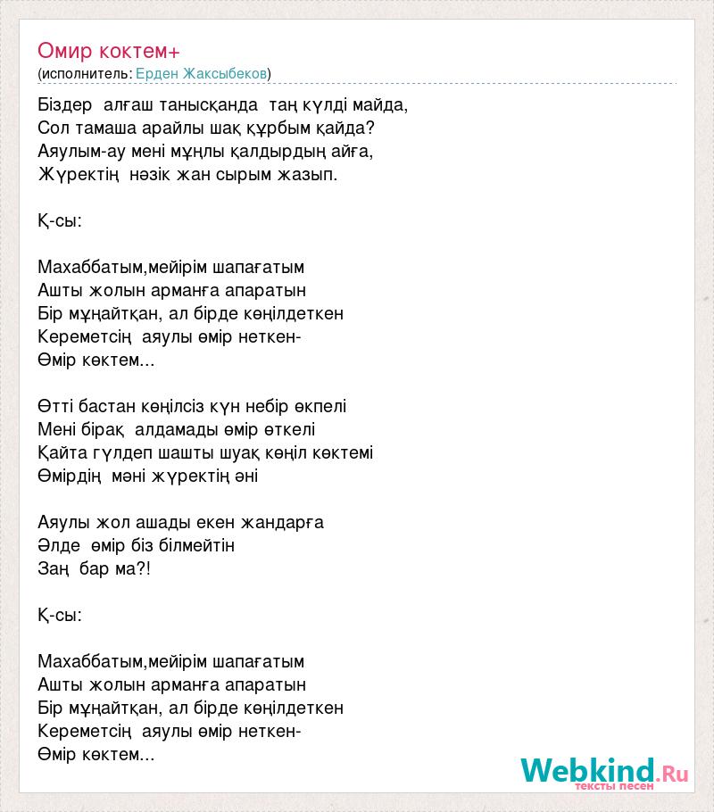Біздер алғаш танысқанда таң күлді майда, Сол тамаша арайлы шақ құрбым қайда? Аяулым-ау мені мұңлы қалдырдың айға, Жүректің нәзік жан сырым жазып. Қ-сы: Махаббатым,мейірім шапағатым Ашты жолын арманға апаратын Бір мұңайтқан, ал бірде көңілдеткен Кереметсің аяулы өмір неткен- Өмір көктем... Өтті бастан көңілсіз күн небір өкпелі Мені бірақ алдамады өмір өткелі Қайта гүлдеп шашты шуақ көңіл көктемі Өмірдің мәні жүректің әні Аяулы жол ашады екен жандарға Әлде өмір біз білмейтін Заң бар ма?! Қ-сы: Махаббатым,мейірім шапағатым Ашты жолын арманға апаратын Бір мұңайтқан, ал бірде көңілдеткен Кереметсің аяулы өмір неткен- Өмір көктем...