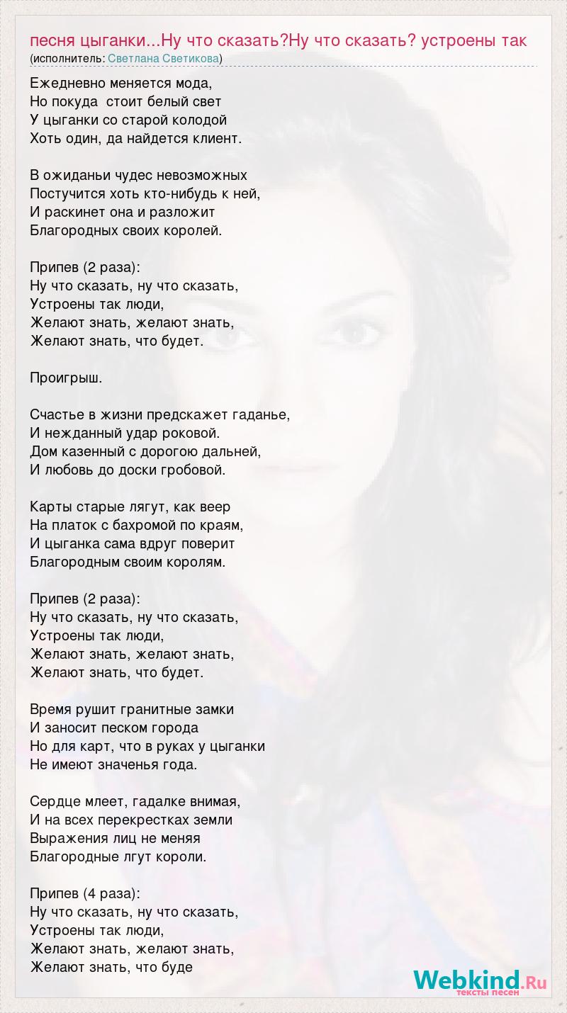 Главная→Исполнители→Светлана Светикова→Песня цыганки...Ну что сказать?Ну что сказать? устроены так люди- желают знать,