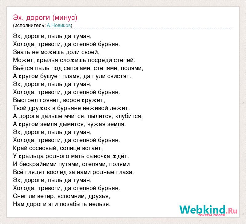 Эх, дороги, пыль да туман, Холода, тревоги, да степной бурьян. Знать не можешь доли своей, Может, крылья сложишь посреди степей. Вьётся пыль под сапогами, степями, полями, А кругом бушует пламя, да пули свистят. Эх, дороги, пыль да туман, Холода, тревоги, да степной бурьян. Выстрел грянет, ворон кружит, Твой дружок в бурьяне неживой лежит. А дорога дальше мчится, пылится, клубится, А кругом земля дымится, чужая земля. Эх, дороги, пыль да туман, Холода, тревоги, да степной бурьян. Край сосновый, солнце встаёт, У крыльца родного мать сыночка ждёт. И бескрайними путями, степями, полями Всё глядят вослед за нами родные глаза. Эх, дороги, пыль да туман, Холода, тревоги, да степной бурьян. Снег ли ветер, вспомним, друзья, Нам дороги эти позабыть нельзя.