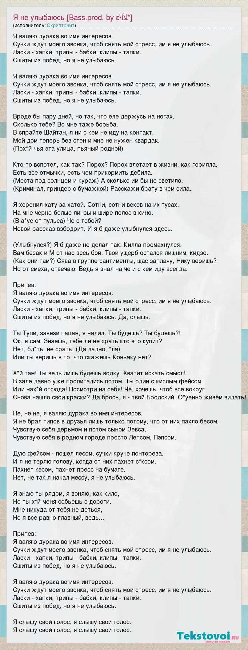 Я валяю дурака во имя интересов. Сучки ждут моего звонка, чтоб снять мой стресс, им я не улыбаюсь. Ласки - хапки, трипы - бабки, клипы - тапки. Сшиты из побед, но я не улыбаюсь. Я валяю дурака во имя интересов. Сучки ждут моего звонка, чтоб снять мой стресс, им я не улыбаюсь. Ласки - хапки, трипы - бабки, клипы - тапки. Сшиты из побед, но я не улыбаюсь. Вроде бы пару дней, но так, что еле держусь на ногах. Сколько тебе? Во мне таже борьба. В спрайте Шайтан, я ни с кем не иду на контакт. Мой дом теперь без стен и мне не нужен квардак. (Пох*й чья эта улица, пьяный родной) Кто-то вспотел, как так? Порох? Порох влетает в жизни, как горилла. Есть все отмычки, есть чем прикормить дебила. (Места под солнцем и кураж) А сколько им бы не светило. (Криминал, гриндер с бумажкой) Расскажи брату в чем сила. Я хоронил хату за хатой. Сотни, сотни веков на их тусах. На мне черно-белые линзы и шире полос в кино. (В а*уе от пульса) Че с тобой? Новой рассказ взбодрит. И я б даже улыбнулся здесь. (Улыбнулся?) Я б даже не делал так. Килла промахнулся. Вам безак и М от нас весь бой. Твой ущерб остался лишним, кидзе. (Как они там?) Сява в группе сантименты, щас заплачу, Нику веришь? Но от смеха, отвечаю. Ведь я знал на че и с кем иду всегда. Припев: Я валяю дурака во имя интересов. Сучки ждут моего звонка, чтоб снять мой стресс, им я не улыбаюсь. Ласки - хапки, трипы - бабки, клипы - тапки. Сшиты из побед, но я не улыбаюсь. Да, слышь. Ты Тупи, завези пацан, я налил. Ты будешь? Ты будешь?! Ок, я сам. Знаешь, тебе ли не срать кто это купит? Нет, бл*ть, не срать! (Да ладно, *ля) Или ты веришь в то, что скажешь Коньяку нет? Х*й там! Ты ведь лишь будешь водку. Хватит искать смысл! В зале давно уже пропитались потом. Ты один с кислым фейсом. Иди нах*й отсюда! Посмотри на себя! Чё, хочешь, чтоб всё вокруг Снова нашло свои краски? Да брось, я - твой Бродский. О*уенно живём видать! Не, не не, я валяю дурака во имя интересов. Я не брал типов в друзья лишь только потому, что от них пахло бесом. Чувствую себя дерьмом и потом сыном Зевса, Чувствую себя в родном городе просто Лепсом, Пэпсом. Дую фейсом - пошел лесом, сучки круче понтореза. И я не теряю голову, когда от них пахнет с*ксом. Пахнет кэсом, пахнет пресс на бумаге. Нет, не так я начал мессу, я не улыбаюсь. Я знаю ты рядом, я воняю, как кило, Но ты х*й меня собьешь с дороги. Мне никуда от тебя не деться, Но я все равно главный, ведь... Припев: Я валяю дурака во имя интересов. Сучки ждут моего звонка, чтоб снять мой стресс, им я не улыбаюсь. Ласки - хапки, трипы - бабки, клипы - тапки. Сшиты из побед, но я не улыбаюсь. Я валяю дурака во имя интересов. Сучки ждут моего звонка, чтоб снять мой стресс, им я не улыбаюсь. Ласки - хапки, трипы - бабки, клипы - тапки. Сшиты из побед, но я не улыбаюсь. Я слышу свой голос, я слышу свой голос. Я слышу свой голос, я слышу свой голос.