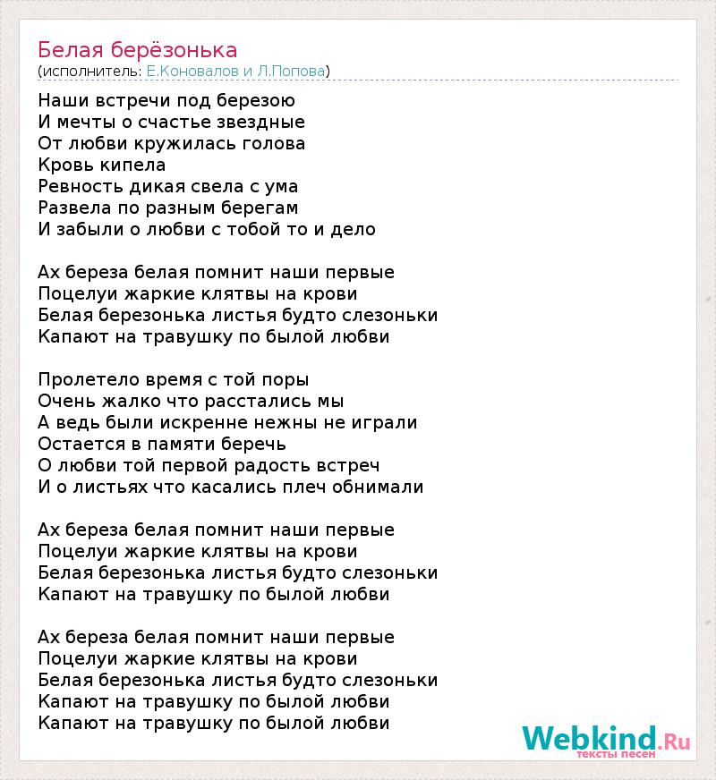 Наши встречи под березою И мечты о счастье звездные От любви кружилась голова Кровь кипела Ревность дикая свела с ума Развела по разным берегам И забыли о любви с тобой то и дело Ах береза белая помнит наши первые Поцелуи жаркие клятвы на крови Белая березонька листья будто слезоньки Капают на травушку по былой любви Пролетело время с той поры Очень жалко что расстались мы А ведь были искренне нежны не играли Остается в памяти беречь О любви той первой радость встреч И о листьях что касались плеч обнимали Ах береза белая помнит наши первые Поцелуи жаркие клятвы на крови Белая березонька листья будто слезоньки Капают на травушку по былой любви Ах береза белая помнит наши первые Поцелуи жаркие клятвы на крови Белая березонька листья будто слезоньки Капают на травушку по былой любви Капают на травушку по былой любви