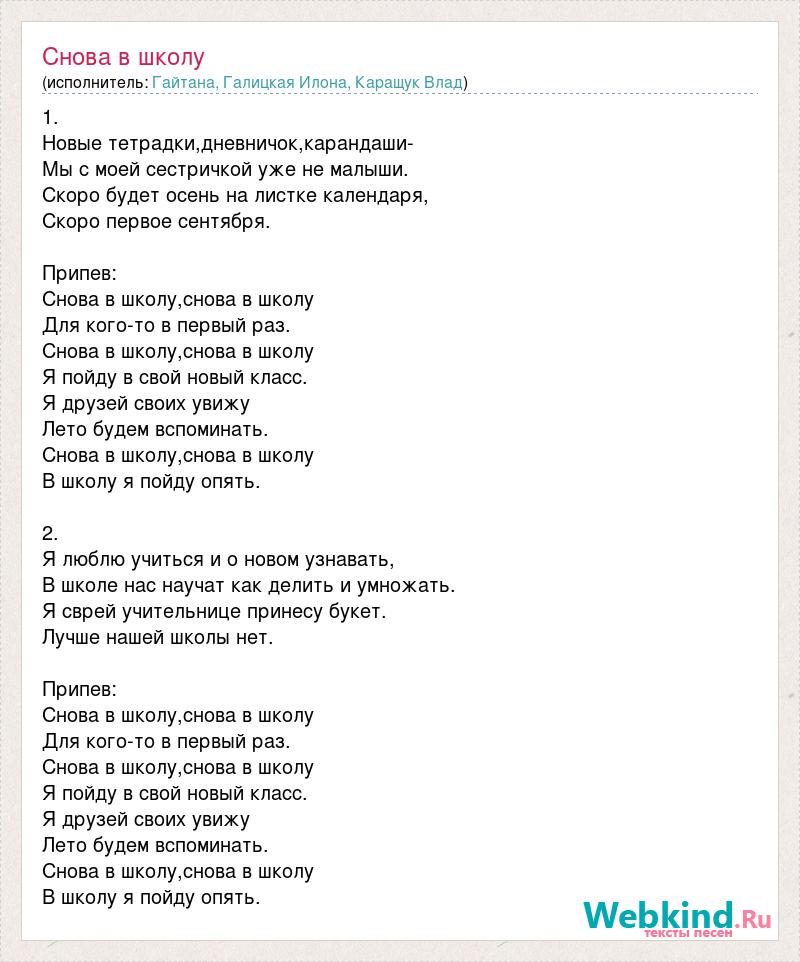 1. Новые тетрадки,дневничок,карандаши- Мы с моей сестричкой уже не малыши. Скоро будет осень на листке календаря, Скоро первое сентября. Припев: Снова в школу,снова в школу Для кого-то в первый раз. Снова в школу,снова в школу Я пойду в свой новый класс. Я друзей своих увижу Лето будем вспоминать. Снова в школу,снова в школу В школу я пойду опять. 2. Я люблю учиться и о новом узнавать, В школе нас научат как делить и умножать. Я сврей учительнице принесу букет. Лучше нашей школы нет. Припев: Снова в школу,снова в школу Для кого-то в первый раз. Снова в школу,снова в школу Я пойду в свой новый класс. Я друзей своих увижу Лето будем вспоминать. Снова в школу,снова в школу В школу я пойду опять.