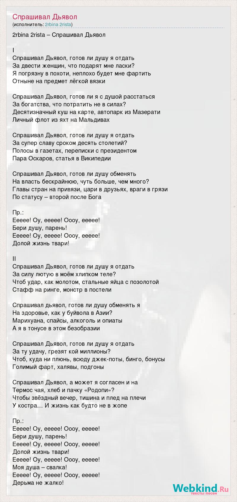 2rbina 2rista – Спрашивал Дьявол I Спрашивал Дьявол, готов ли душу я отдать За двести женщин, что подарят мне ласки? Я погрязну в похоти, неплохо будет мне фартить Отныне на предмет лёгкой вязки Спрашивал Дьявол, готов ли я с душой расстаться За богатства, что потратить не в силах? Десятизначный куш на карте, автопарк из Мазерати Личный флот из яхт на Мальдивах Спрашивал Дьявол, готов ли душу я отдать За супер славу сроком десять столетий? Полосы в газетах, переписки с президентом Пара Оскаров, статья в Википедии Спрашивал Дьявол, готов ли душу обменять На власть бескрайнюю, чуть больше, чем много? Главы стран на привязи, цари в друзьях, враги в грязи По статусу – второй после Бога Пр.: Еееее! Оу, еееее! Оооу, еееее! Бери душу, парень! Еееее! Оу, еееее! Оооу, еееее! Долой жизнь твари! II Спрашивал Дьявол, готов ли душу я отдать За силу лютую в моём хлипком теле? Чтоб удар, как молотом, стальные яйца с позолотой Стафф на ринге, монстр в постели Спрашивал дьявол, готов ли душу обменять я На здоровье, как у буйвола в Азии? Марихуана, спайсы, алкоголь и опиаты А я в тонусе в этом безобразии Спрашивал Дьявол, готов ли душу я отдать За ту удачу, грезят кой миллионы? Чтоб, куда ни плюнь, всюду джек-поты, бинго, бонусы Голимый фарт, халявы, подгоны Спрашивал Дьявол, а может я согласен и на Термос чая, хлеб и пачку «Родопи»? Чтобы звёздный вечер, тишина и плед на плечи У костра… И жизнь как будто не в жопе Пр.: Еееее! Оу, еееее! Оооу, еееее! Бери душу, парень! Еееее! Оу, еееее! Оооу, еееее! Долой жизнь твари! Еееее! Оу, еееее! Оооу, еееее! Моя душа – свалка! Еееее! Оу, еееее! Оооу, еееее! Дерьма не жалко!