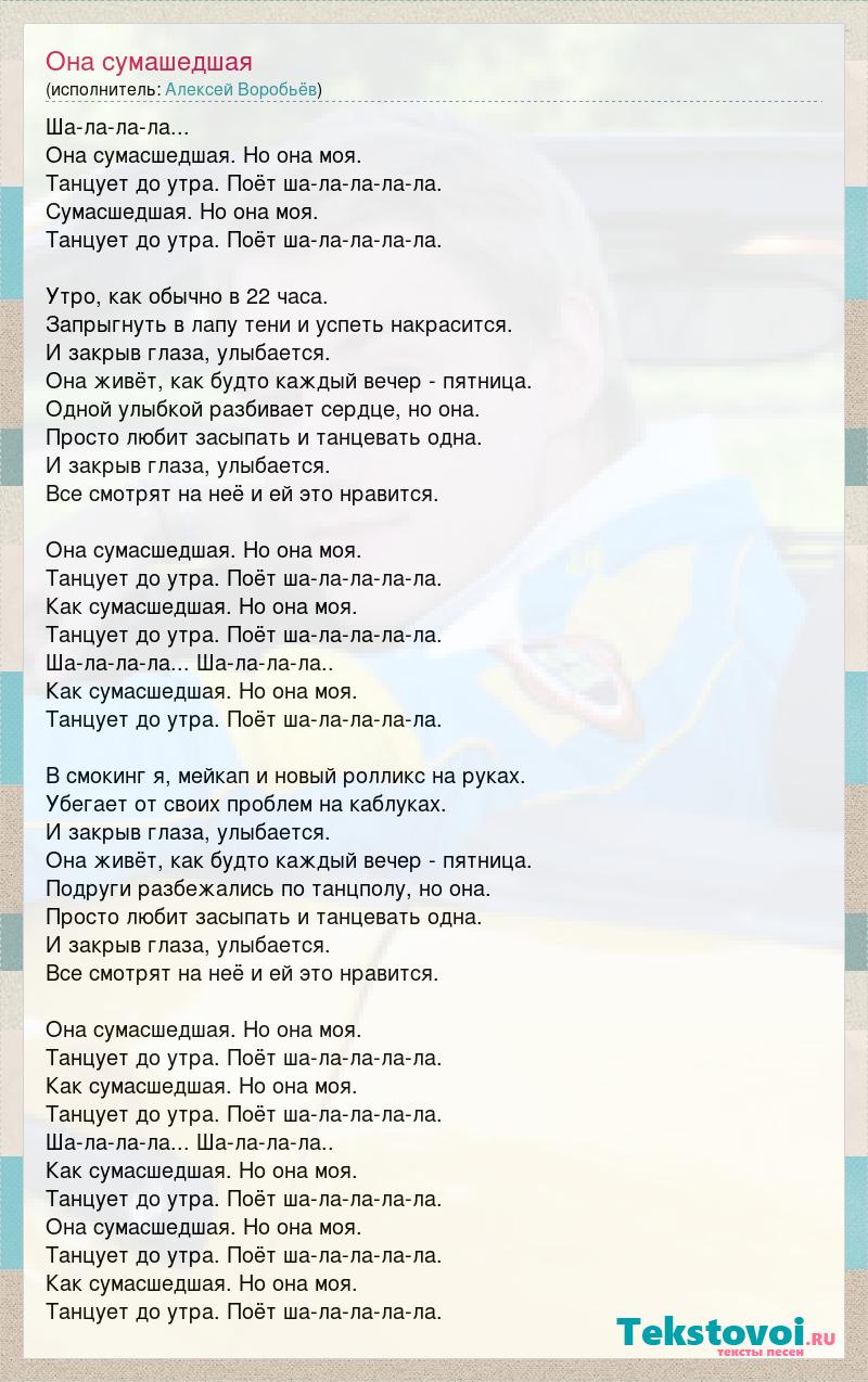 Ша-ла-ла-ла... Она сумасшедшая. Но она моя. Танцует до утра. Поёт ша-ла-ла-ла-ла. Сумасшедшая. Но она моя. Танцует до утра. Поёт ша-ла-ла-ла-ла. Утро, как обычно в 22 часа. Запрыгнуть в лапу тени и успеть накрасится. И закрыв глаза, улыбается. Она живёт, как будто каждый вечер - пятница. Одной улыбкой разбивает сердце, но она. Просто любит засыпать и танцевать одна. И закрыв глаза, улыбается. Все смотрят на неё и ей это нравится. Она сумасшедшая. Но она моя. Танцует до утра. Поёт ша-ла-ла-ла-ла. Как сумасшедшая. Но она моя. Танцует до утра. Поёт ша-ла-ла-ла-ла. Ша-ла-ла-ла... Ша-ла-ла-ла.. Как сумасшедшая. Но она моя. Танцует до утра. Поёт ша-ла-ла-ла-ла. В смокинг я, мейкап и новый ролликс на руках. Убегает от своих проблем на каблуках. И закрыв глаза, улыбается. Она живёт, как будто каждый вечер - пятница. Подруги разбежались по танцполу, но она. Просто любит засыпать и танцевать одна. И закрыв глаза, улыбается. Все смотрят на неё и ей это нравится. Она сумасшедшая. Но она моя. Танцует до утра. Поёт ша-ла-ла-ла-ла. Как сумасшедшая. Но она моя. Танцует до утра. Поёт ша-ла-ла-ла-ла. Ша-ла-ла-ла... Ша-ла-ла-ла.. Как сумасшедшая. Но она моя. Танцует до утра. Поёт ша-ла-ла-ла-ла. Она сумасшедшая. Но она моя. Танцует до утра. Поёт ша-ла-ла-ла-ла. Как сумасшедшая. Но она моя. Танцует до утра. Поёт ша-ла-ла-ла-ла.