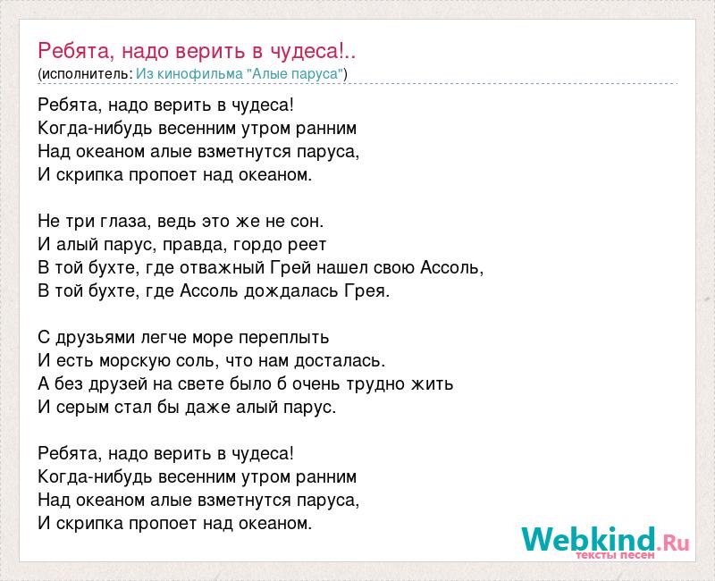Ребята, надо верить в чудеса! Когда-нибудь весенним утром ранним Над океаном алые взметнутся паруса, И скрипка пропоет над океаном. Не три глаза, ведь это же не сон. И алый парус, правда, гордо реет В той бухте, где отважный Грей нашел свою Ассоль, В той бухте, где Ассоль дождалась Грея. С друзьями легче море переплыть И есть морскую соль, что нам досталась. А без друзей на свете было б очень трудно жить И серым стал бы даже алый парус. Ребята, надо верить в чудеса! Когда-нибудь весенним утром ранним Над океаном алые взметнутся паруса, И скрипка пропоет над океаном.