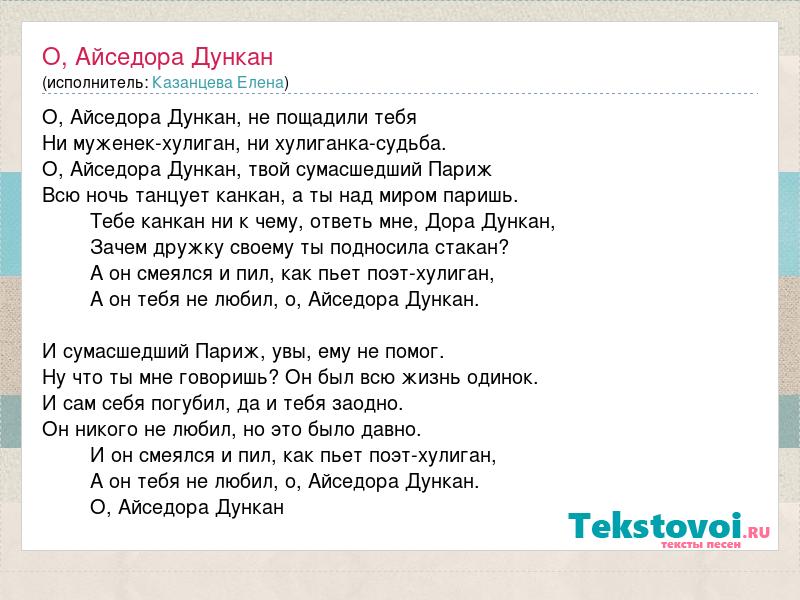 А как ты думаешь, о чем песня "О, Айседора Дункан" ?