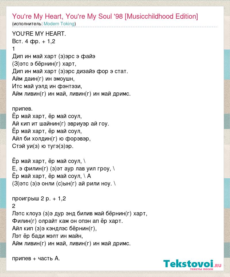 YOU'RE MY HEART. Вст. 4 фр. + 1,2 1 Дип ин май харт (з)эрс э файэ (З)этс э бёрнин(г) харт, Дип ин май харт (з)эрс дизайэ фор э стат. Айм даин(г) ин эмоушн, Итс май уэлд ин фэнтэзи, Айм ливин(г) ин май, ливин(г) ин май дримс. припев. Ёр май харт, ёр май соул, Ай кип ит шайнин(г) эвриуэр ай гоу. Ёр май харт, ёр май соул, Айл би холдин(г) ю форэвэр, Стэй уи(з) ю тугэ(з)эр. Ёр май харт, ёр май соул, \ Е, э филин(г) (з)эт аур лав уил гроу, \ Ёр май харт, ёр май соул, \ А (З)этс (з)э онли (с)ын(г) ай рили ноу. \ проигрыш 2 р. + 1,2 2 Лэтс клоуз (з)э дур энд билив май бёрнин(г) харт, Филин(г) олрайт кам он опэн ап ёр харт. Айл кип (з)э кэндлэс бёрнин(г), Лэт ёр бади мэлт ин майн, Айм ливин(г) ин май, ливин(г) ин май дримс. припев + часть А.