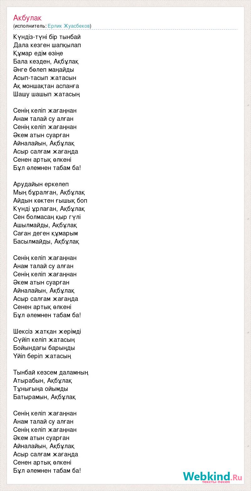 Күндіз-түні бір тынбай Дала кезген шапқылап Құмар едім өзіңе Бала кезден, Ақбұлақ Әнге бөлеп маңайды Асып-тасып жатасын Ақ моншақтан аспанға Шашу шашып жатасың Сенің келіп жағаңнан Анам талай су алған Сенің келіп жағаңнан Әкем атын суарған Айналайын, Ақбұлақ Асыр салғам жағаңда Сенен артық өлкені Бұл әлемнен табам ба! Арудайын еркелеп Мың бұралған, Ақбұлақ Айдын көктен ғышық боп Күнді ұрлаған, Ақбұлақ Сен болмасаң қыр гүлі Ашылмайды, Ақбұлақ Саған деген құмарым Басылмайды, Ақбұлақ Сенің келіп жағаңнан Анам талай су алған Сенің келіп жағаңнан Әкем атын суарған Айналайын, Ақбұлақ Асыр салғам жағаңда Сенен артық өлкені Бұл әлемнен табам ба! Шексіз жатқан жерімді Сүйіп келіп жатасың Бойындағы барыңды Үйіп беріп жатасың Тынбай кезсем даламның Атырабын, Ақбұлақ Тұнығыңа ойымды Батырамын, Ақбұлақ Сенің келіп жағаңнан Анам талай су алған Сенің келіп жағаңнан Әкем атын суарған Айналайын, Ақбұлақ Асыр салғам жағаңда Сенен артық өлкені Бұл әлемнен табам ба!