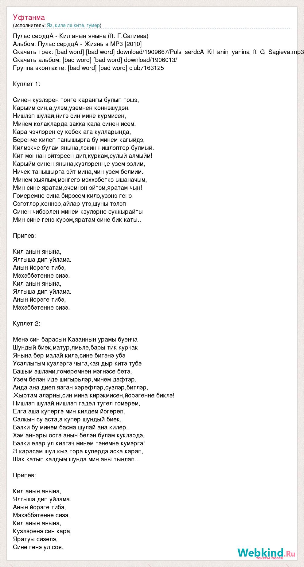 Пульс сердцА - Кил анын янына (ft. Г.Сагиева) Альбом: Пульс сердцА - Жизнь в MP3 [2010] Скачать трек: [bad word] [bad word] download/1909667/Puls_serdcA_Kil_anin_yanina_ft_G_Sagieva.mp3 Скачать альбом: [bad word] [bad word] download/1906013/ Группа вконтакте: [bad word] [bad word] club7163125 Куплет 1: Синен кузлэрен тонге карангы булып тошэ, Карыйм син,а,улэм,уземнен коннэшудэн. Нишлэп шулай,нигэ син мине курмисен, Минем колакларда закка кала синен исем. Кара чэчлэрен су кебек ага кулларында, Беренче килеп танышырга бу минем кагыйдэ, Килмэкче булам янына,лэкин нишлэптер булмый. Кит моннан эйтэрсен дип,куркам,сулый алмыйм! Карыйм синен янына,кузлэренн,е узем эзлим, Ничек танышырга эйт мина,мин узем белмим. Минем хыялым,мэнгегэ мэххэбеткэ ышаначым, Мин сине яратам,эчемнэн эйтэм,яратам чын! Гомеремне сина бирэсем килэ,узэнэ генэ Сэгэтлэр,коннэр,айлар утэ,шуны тэлэп Синен чибэрлен минем кзулэрне суккырайты Мин сине генэ курэм,яратам сине бик каты.. Припев: Кил анын янына, Ялгыша дип уйлама. Анын йорэге тибэ, Мэхэббэтенне сизэ. Кил анын янына, Ялгыша дип уйлама. Анын йорэге тибэ, Мэхэббэтенне сизэ. Куплет 2: Менэ син барасын Казаннын урамы буенча Шундый биек,матур,ямьле,бары тик курчак Янына бер малай килэ,сине битэнэ убэ Усаллыгым кузлэргэ чыга,кая дыр китэ тубэ Башым эшлэми,гомеремнен мэгнэсе бетэ, Узем белэн иде шигырьлэр,минем дэфтэр. Анда ана диеп язган хэрефлэр,сузлэр,битлэр, Жыртам аларны,син мина кирэкмисен,йорэгенне биклэ! Нишлэп шулай,нишлэп гадел тугел гомерем, Елга аша купергэ мин килдем йогереп. Салкын су аста,э купер шундый биек, Бэлки бу минем басма шулай ана килер.. Хэм аннары остэ анын белэн булам куклэрдэ, Бэлки елар ул килгэч минем тэнемне кумэргэ! Э карасам шул кыз тора купердэ аска карап, Шак катып калдым шунда мин аны тынлап... Припев: Кил анын янына, Ялгыша дип уйлама. Анын йорэге тибэ, Мэхэббэтенне сизэ. Кил анын янына, Кузлэренэ син кара, Яратуы сизелэ, Сине генэ ул соя.