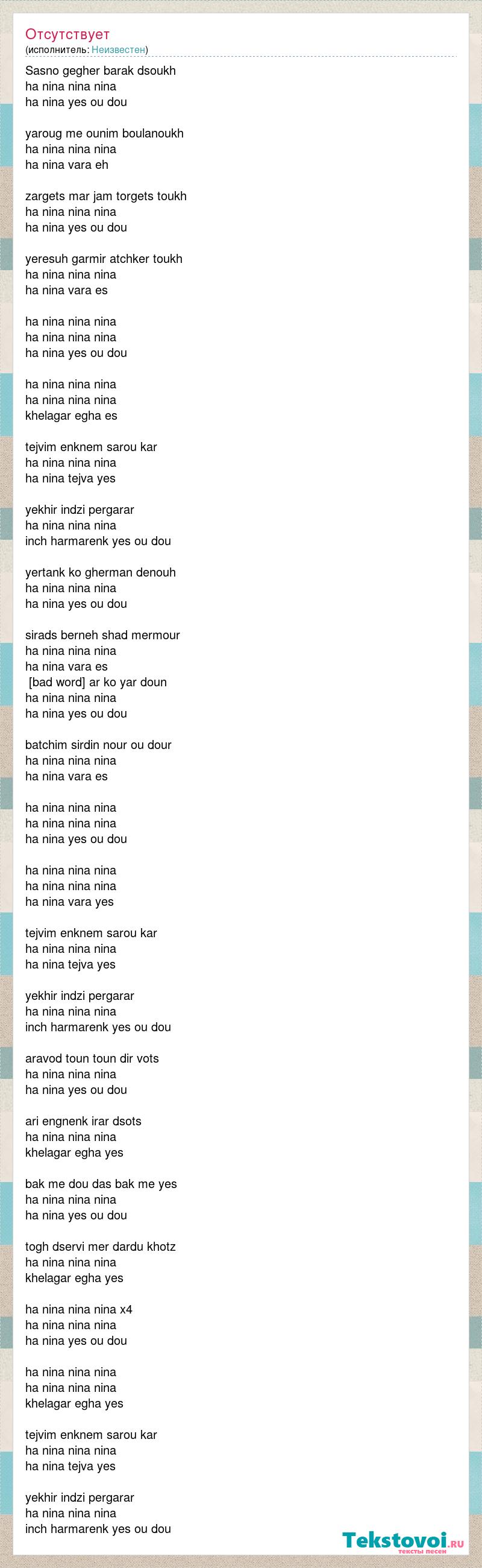 Sasno gegher barak dsoukh ha nina nina nina ha nina yes ou dou yaroug me ounim boulanoukh ha nina nina nina ha nina vara eh zargets mar jam torgets toukh ha nina nina nina ha nina yes ou dou yeresuh garmir atchker toukh ha nina nina nina ha nina vara es ha nina nina nina ha nina nina nina ha nina yes ou dou ha nina nina nina ha nina nina nina khelagar egha es tejvim enknem sarou kar ha nina nina nina ha nina tejva yes yekhir indzi pergarar ha nina nina nina inch harmarenk yes ou dou yertank ko gherman denouh ha nina nina nina ha nina yes ou dou sirads berneh shad mermour ha nina nina nina ha nina vara es [bad word] ar ko yar doun ha nina nina nina ha nina yes ou dou batchim sirdin nour ou dour ha nina nina nina ha nina vara es ha nina nina nina ha nina nina nina ha nina yes ou dou ha nina nina nina ha nina nina nina ha nina vara yes tejvim enknem sarou kar ha nina nina nina ha nina tejva yes yekhir indzi pergarar ha nina nina nina inch harmarenk yes ou dou aravod toun toun dir vots ha nina nina nina ha nina yes ou dou ari engnenk irar dsots ha nina nina nina khelagar egha yes bak me dou das bak me yes ha nina nina nina ha nina yes ou dou togh dservi mer dardu khotz ha nina nina nina khelagar egha yes ha nina nina nina x4 ha nina nina nina ha nina yes ou dou ha nina nina nina ha nina nina nina khelagar egha yes tejvim enknem sarou kar ha nina nina nina ha nina tejva yes yekhir indzi pergarar ha nina nina nina inch harmarenk yes ou dou