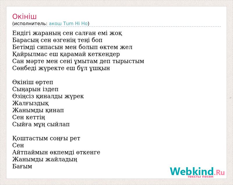 Ендігі жараның сен салған емі жоқ Барасың сен өзгенің теңі боп Бетімді сипасын мен болып өктем жел Қайрылмас еш қарамай кеткендер Сан мәрте мен сені ұмытам деп тырыстым Сөнбеді жүректе еш бұл ұшқын Өкініш өртеп Сыңарын іздеп Өзіңсіз қиналды жүрек Жалғыздық Жанымды қинап Сен кеттің Сыйға мұң сыйлап Қоштастым соңғы рет Сен Айтпаймын өкпемді өткенге Жанымды жайладың Бағым