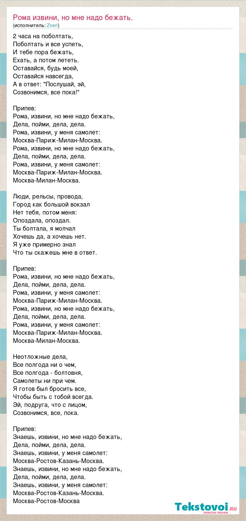 2 часа на поболтать, Поболтать и все успеть, И тебе пора бежать, Ехать, а потом лететь. Оставайся, будь моей, Оставайся навсегда, А в ответ: "Послушай, эй, Созвонимся, все пока!" Припев: Рома, извини, но мне надо бежать, Дела, пойми, дела, дела. Рома, извини, у меня самолет: Москва-Париж-Милан-Москва. Рома, извини, но мне надо бежать, Дела, пойми, дела, дела. Рома, извини, у меня самолет: Москва-Париж-Милан-Москва. Москва-Милан-Москва. Люди, рельсы, провода, Город как большой вокзал Нет тебя, потом меня: Опоздала, опоздал. Ты болтала, я молчал Хочешь да, а хочешь нет. Я уже примерно знал Что ты скажешь мне в ответ. Припев: Рома, извини, но мне надо бежать, Дела, пойми, дела, дела. Рома, извини, у меня самолет: Москва-Париж-Милан-Москва. Рома, извини, но мне надо бежать, Дела, пойми, дела, дела. Рома, извини, у меня самолет: Москва-Париж-Милан-Москва. Москва-Милан-Москва. Неотложные дела, Все полгода ни о чем, Все полгода - болтовня, Самолеты ни при чем. Я готов был бросить все, Чтобы быть с тобой всегда. Эй, подруга, что с лицом, Созвонимся, все, пока. Припев: Знаешь, извини, но мне надо бежать, Дела, пойми, дела, дела. Знаешь, извини, у меня самолет: Москва-Ростов-Казань-Москва. Знаешь, извини, но мне надо бежать, Дела, пойми, дела, дела. Знаешь, извини, у меня самолет: Москва-Ростов-Казань-Москва. Москва-Ростов-Москва