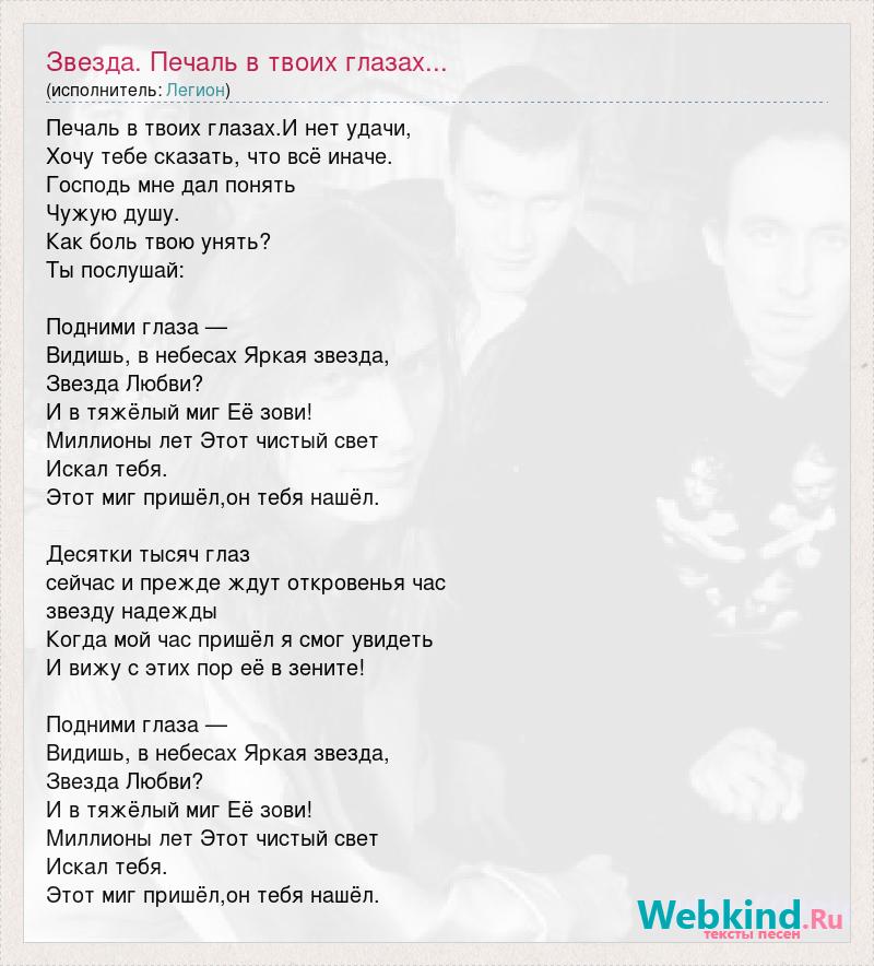 Печаль в твоих глазах.И нет удачи, Хочу тебе сказать, что всё иначе. Господь мне дал понять Чужую душу. Как боль твою унять? Ты послушай: Подними глаза — Видишь, в небесах Яркая звезда, Звезда Любви? И в тяжёлый миг Её зови! Миллионы лет Этот чистый свет Искал тебя. Этот миг пришёл,он тебя нашёл. Десятки тысяч глаз сейчас и прежде ждут откровенья час звезду надежды Когда мой час пришёл я смог увидеть И вижу с этих пор её в зените! Подними глаза — Видишь, в небесах Яркая звезда, Звезда Любви? И в тяжёлый миг Её зови! Миллионы лет Этот чистый свет Искал тебя. Этот миг пришёл,он тебя нашёл.