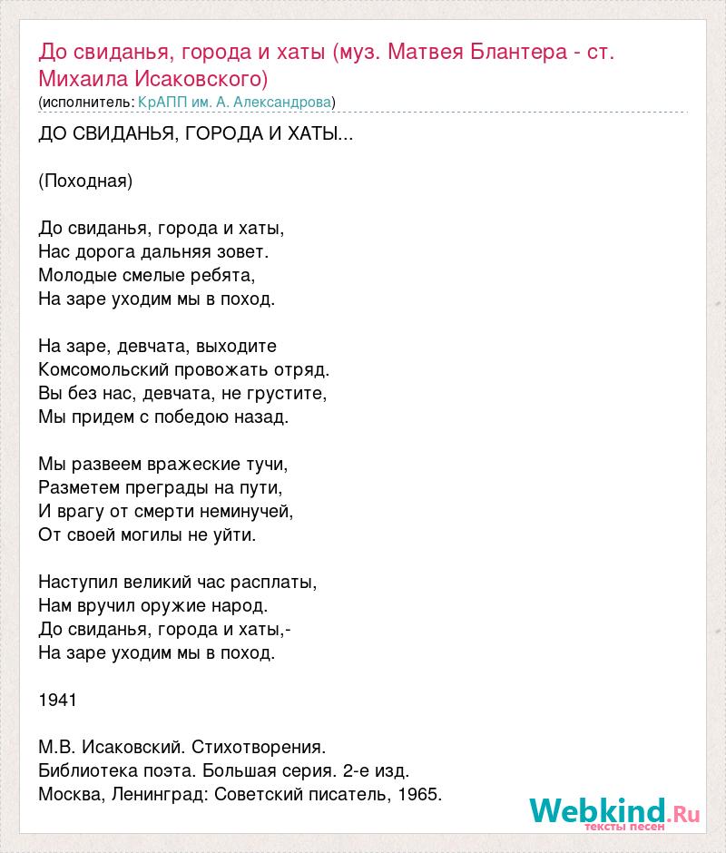 ДО СВИДАНЬЯ, ГОРОДА И ХАТЫ... (Походная) До свиданья, города и хаты, Нас дорога дальняя зовет. Молодые смелые ребята, На заре уходим мы в поход. На заре, девчата, выходите Комсомольский провожать отряд. Вы без нас, девчата, не грустите, Мы придем с победою назад. Мы развеем вражеские тучи, Разметем преграды на пути, И врагу от смерти неминучей, От своей могилы не уйти. Наступил великий час расплаты, Нам вручил оружие народ. До свиданья, города и хаты,- На заре уходим мы в поход. 1941 М.В. Исаковский. Стихотворения. Библиотека поэта. Большая серия. 2-е изд. Москва, Ленинград: Советский писатель, 1965.