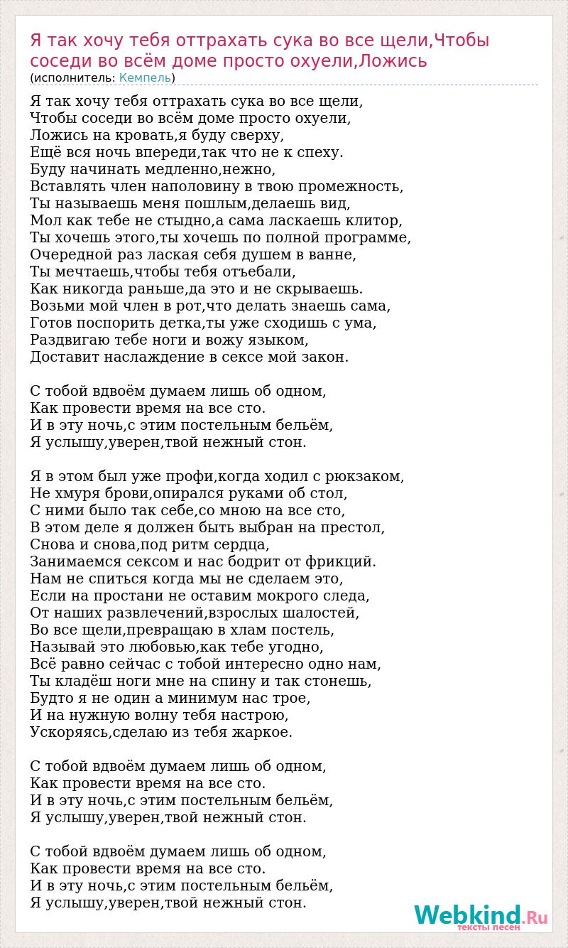 Главная→Исполнители→Кемпель→Я так хочу тебя оттрахать сука во все щели,Чтобы соседи во всём доме просто охуе