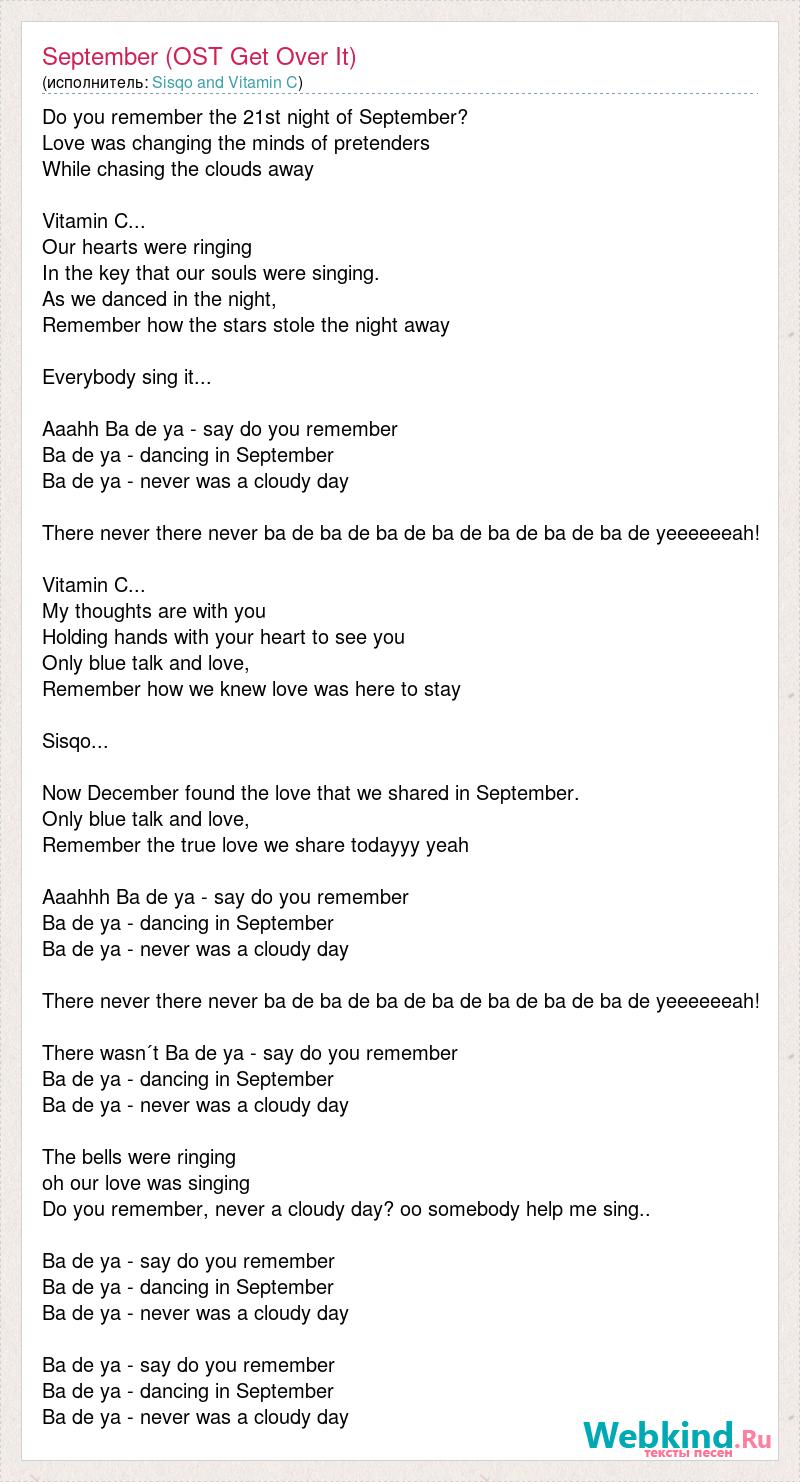 Do you remember the 21st night of September? Love was changing the minds of pretenders While chasing the clouds away Vitamin C... Our hearts were ringing In the key that our souls were singing. As we danced in the night, Remember how the stars stole the night away Everybody sing it... Aaahh Ba de ya - say do you remember Ba de ya - dancing in September Ba de ya - never was a cloudy day There never there never ba de ba de ba de ba de ba de ba de ba de yeeeeeeah! Vitamin C... My thoughts are with you Holding hands with your heart to see you Only blue talk and love, Remember how we knew love was here to stay Sisqo... Now December found the love that we shared in September. Only blue talk and love, Remember the true love we share todayyy yeah Aaahhh Ba de ya - say do you remember Ba de ya - dancing in September Ba de ya - never was a cloudy day There never there never ba de ba de ba de ba de ba de ba de ba de yeeeeeeah! There wasn´t Ba de ya - say do you remember Ba de ya - dancing in September Ba de ya - never was a cloudy day The bells were ringing oh our love was singing Do you remember, never a cloudy day? oo somebody help me sing.. Ba de ya - say do you remember Ba de ya - dancing in September Ba de ya - never was a cloudy day Ba de ya - say do you remember Ba de ya - dancing in September Ba de ya - never was a cloudy day