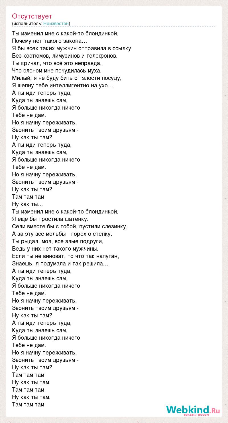Ты изменил мне с какой-то блондинкой, Почему нет такого закона… Я бы всех таких мужчин отправила в ссылку Без костюмов, лимузинов и телефонов. Ты кричал, что всё это неправда, Что слоном мне почудилась муха. Милый, я не буду бить от злости посуду, Я шепну тебе интеллигентно на ухо… А ты иди теперь туда, Куда ты знаешь сам, Я больше никогда ничего Тебе не дам. Но я начну переживать, Звонить твоим друзьям - Ну как ты там? А ты иди теперь туда, Куда ты знаешь сам, Я больше никогда ничего Тебе не дам. Но я начну переживать, Звонить твоим друзьям - Ну как ты там? Там там там Ну как ты... Ты изменил мне с какой-то блондинкой, Я ещё бы простила шатенку. Сели вместе бы с тобой, пустили слезинку, А за эту все мольбы - горох о стенку. Ты рыдал, мол, все злые подруги, Ведь у них нет такого мужчины. Если ты не виноват, то что так напуган, Знаешь, я подумала и так решила… А ты иди теперь туда, Куда ты знаешь сам, Я больше никогда ничего Тебе не дам. Но я начну переживать, Звонить твоим друзьям - Ну как ты там? А ты иди теперь туда, Куда ты знаешь сам, Я больше никогда ничего Тебе не дам. Но я начну переживать, Звонить твоим друзьям - Ну как ты там? Там там там Ну как ты там. Там там там Ну как ты там. Там там там