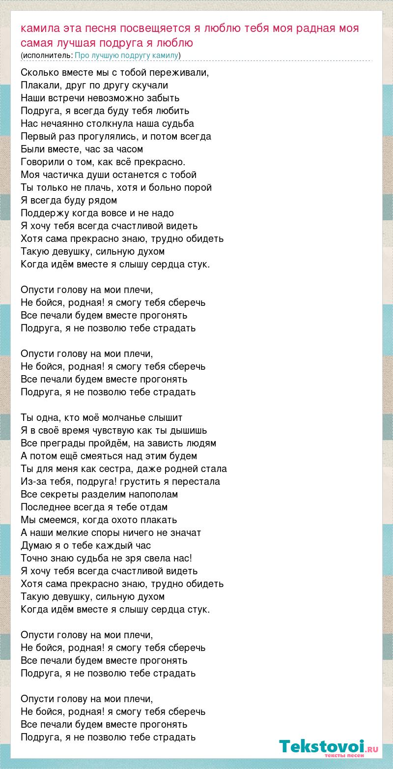 Сколько вместе мы с тобой переживали, Плакали, друг по другу скучали Наши встречи невозможно забыть Подруга, я всегда буду тебя любить Нас нечаянно столкнула наша судьба Первый раз прогулялись, и потом всегда Были вместе, час за часом Говорили о том, как всё прекрасно. Моя частичка души останется с тобой Ты только не плачь, хотя и больно порой Я всегда буду рядом Поддержу когда вовсе и не надо Я хочу тебя всегда счастливой видеть Хотя сама прекрасно знаю, трудно обидеть Такую девушку, сильную духом Когда идём вместе я слышу сердца стук. Опусти голову на мои плечи, Не бойся, родная! я смогу тебя сберечь Все печали будем вместе прогонять Подруга, я не позволю тебе страдать Опусти голову на мои плечи, Не бойся, родная! я смогу тебя сберечь Все печали будем вместе прогонять Подруга, я не позволю тебе страдать Ты одна, кто моё молчанье слышит Я в своё время чувствую как ты дышишь Все преграды пройдём, на зависть людям А потом ещё смеяться над этим будем Ты для меня как сестра, даже родней стала Из-за тебя, подруга! грустить я перестала Все секреты разделим напополам Последнее всегда я тебе отдам Мы смеемся, когда охото плакать А наши мелкие споры ничего не значат Думаю я о тебе каждый час Точно знаю судьба не зря свела нас! Я хочу тебя всегда счастливой видеть Хотя сама прекрасно знаю, трудно обидеть Такую девушку, сильную духом Когда идём вместе я слышу сердца стук. Опусти голову на мои плечи, Не бойся, родная! я смогу тебя сберечь Все печали будем вместе прогонять Подруга, я не позволю тебе страдать Опусти голову на мои плечи, Не бойся, родная! я смогу тебя сберечь Все печали будем вместе прогонять Подруга, я не позволю тебе страдать