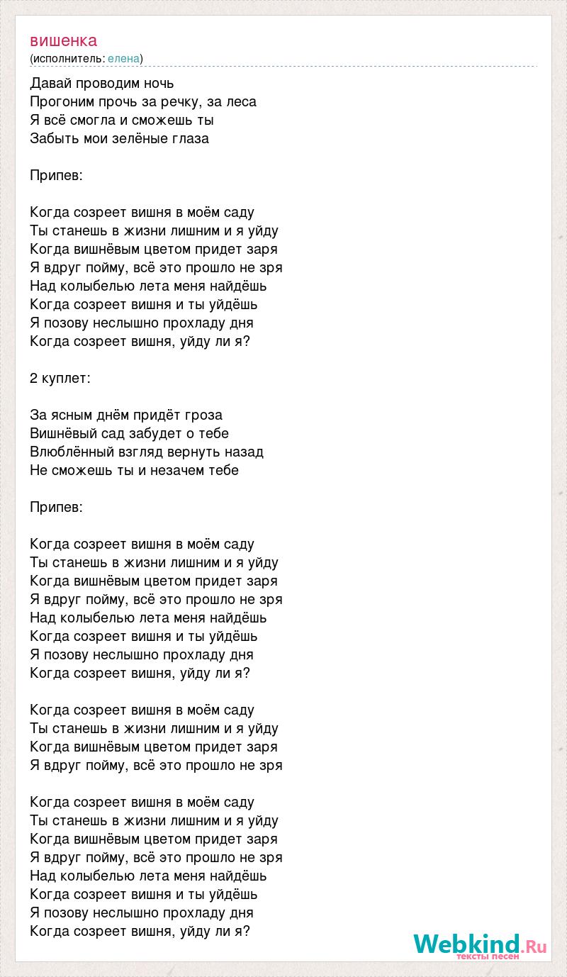 Давай проводим ночь Прогоним прочь за речку, за леса Я всё смогла и сможешь ты Забыть мои зелёные глаза Припев: Когда созреет вишня в моём саду Ты станешь в жизни лишним и я уйду Когда вишнёвым цветом придет заря Я вдруг пойму, всё это прошло не зря Над колыбелью лета меня найдёшь Когда созреет вишня и ты уйдёшь Я позову неслышно прохладу дня Когда созреет вишня, уйду ли я? 2 куплет: За ясным днём придёт гроза Вишнёвый сад забудет о тебе Влюблённый взгляд вернуть назад Не сможешь ты и незачем тебе Припев: Когда созреет вишня в моём саду Ты станешь в жизни лишним и я уйду Когда вишнёвым цветом придет заря Я вдруг пойму, всё это прошло не зря Над колыбелью лета меня найдёшь Когда созреет вишня и ты уйдёшь Я позову неслышно прохладу дня Когда созреет вишня, уйду ли я? Когда созреет вишня в моём саду Ты станешь в жизни лишним и я уйду Когда вишнёвым цветом придет заря Я вдруг пойму, всё это прошло не зря Когда созреет вишня в моём саду Ты станешь в жизни лишним и я уйду Когда вишнёвым цветом придет заря Я вдруг пойму, всё это прошло не зря Над колыбелью лета меня найдёшь Когда созреет вишня и ты уйдёшь Я позову неслышно прохладу дня Когда созреет вишня, уйду ли я?