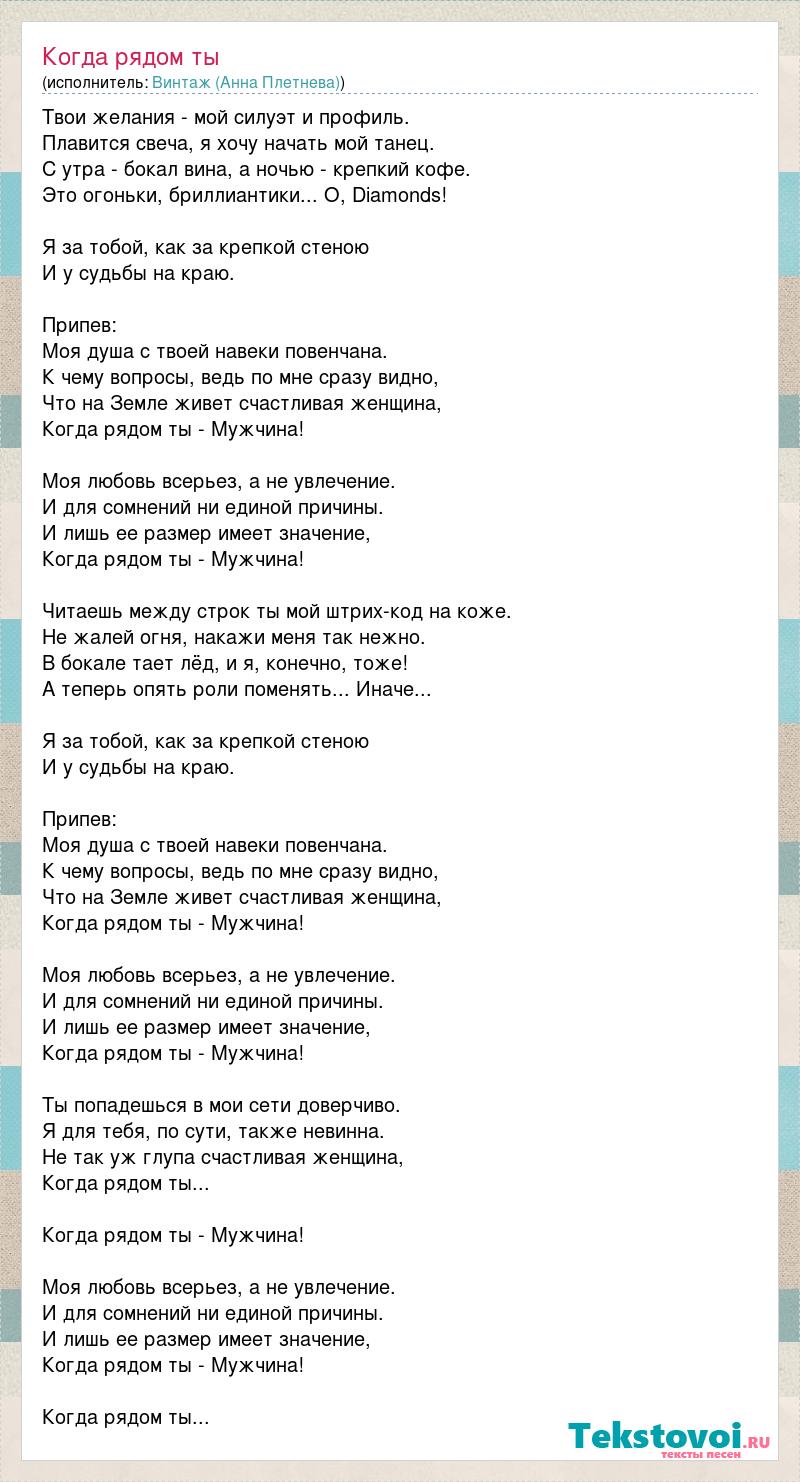 Твои желания - мой силуэт и профиль. Плавится свеча, я хочу начать мой танец. С утра - бокал вина, а ночью - крепкий кофе. Это огоньки, бриллиантики... О, Diamonds! Я за тобой, как за крепкой стеною И у судьбы на краю. Припев: Моя душа с твоей навеки повенчана. К чему вопросы, ведь по мне сразу видно, Что на Земле живет счастливая женщина, Когда рядом ты - Мужчина! Моя любовь всерьез, а не увлечение. И для сомнений ни единой причины. И лишь ее размер имеет значение, Когда рядом ты - Мужчина! Читаешь между строк ты мой штрих-код на коже. Не жалей огня, накажи меня так нежно. В бокале тает лёд, и я, конечно, тоже! А теперь опять роли поменять... Иначе... Я за тобой, как за крепкой стеною И у судьбы на краю. Припев: Моя душа с твоей навеки повенчана. К чему вопросы, ведь по мне сразу видно, Что на Земле живет счастливая женщина, Когда рядом ты - Мужчина! Моя любовь всерьез, а не увлечение. И для сомнений ни единой причины. И лишь ее размер имеет значение, Когда рядом ты - Мужчина! Ты попадешься в мои сети доверчиво. Я для тебя, по сути, также невинна. Не так уж глупа счастливая женщина, Когда рядом ты... Когда рядом ты - Мужчина! Моя любовь всерьез, а не увлечение. И для сомнений ни единой причины. И лишь ее размер имеет значение, Когда рядом ты - Мужчина! Когда рядом ты...