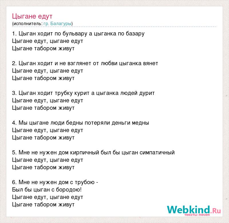 1. Цыган ходит по бульвару а цыганка по базару Цыгане едут, цыгане едут Цыгане табором живут 2. Цыган ходит и не взглянет от любви цыганка вянет Цыгане едут, цыгане едут Цыгане табором живут 3. Цыган ходит трубку курит а цыганка людей дурит Цыгане едут, цыгане едут Цыгане табором живут 4. Мы цыгане люди бедны потеряли деньги медны Цыгане едут, цыгане едут Цыгане табором живут 5. Мне не нужен дом кирпичный был бы цыган симпатичный Цыгане едут, цыгане едут Цыгане табором живут 6. Мне не нужен дом с трубою - Был бы цыган с бородою! Цыгане едут, цыгане едут Цыгане табором живут