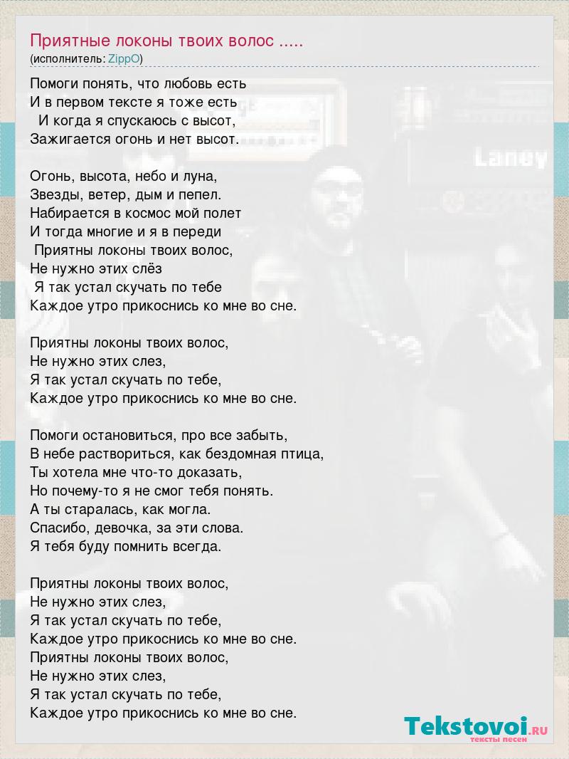 Помоги понять, что любовь есть И в первом тексте я тоже есть И когда я спускаюсь с высот, Зажигается огонь и нет высот. Огонь, высота, небо и луна, Звезды, ветер, дым и пепел. Набирается в космос мой полет И тогда многие и я в переди Приятны локоны твоих волос, Не нужно этих слёз Я так устал скучать по тебе Каждое утро прикоснись ко мне во сне. Приятны локоны твоих волос, Не нужно этих слез, Я так устал скучать по тебе, Каждое утро прикоснись ко мне во сне. Помоги остановиться, про все забыть, В небе раствориться, как бездомная птица, Ты хотела мне что-то доказать, Но почему-то я не смог тебя понять. А ты старалась, как могла. Спасибо, девочка, за эти слова. Я тебя буду помнить всегда. Приятны локоны твоих волос, Не нужно этих слез, Я так устал скучать по тебе, Каждое утро прикоснись ко мне во сне. Приятны локоны твоих волос, Не нужно этих слез, Я так устал скучать по тебе, Каждое утро прикоснись ко мне во сне.