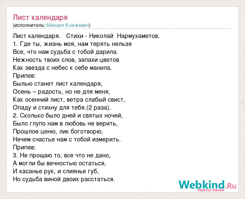 Лист календаря. Стихи - Николай Нармухаметов. 1. Где ты, жизнь моя, нам терять нельзя Все, что нам судьба с тобой дарила. Нежность твоих слов, запахи цветов Как звезда с небес к себе манила. Припев: Былью станет лист календаря, Осень – радость, но не для меня, Как осенний лист, ветра слабый свист, Опаду и стихну для тебя.(2 раза). 2. Сколько было дней и святых ночей, Было глупо нам в любовь не верить, Прошлое ценю, лик боготворю, Нечем счастье нам с тобой измерить. Припев: 3. Не прощаю то, все что не дано, А могли бы вечностью остаться, И касанье рук, и слиянье губ, Но судьба виной двоих расстаться.
