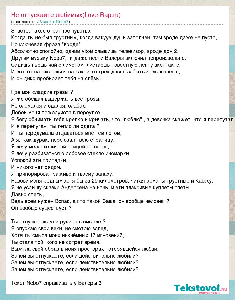 Знаете, такое странное чувство, Когда ты не был грустным, когда вакуум души заполнен, там вроде даже не пусто, Но ключевая фраза "вроде". Абсолютно спокойно, одним ухом слышишь телевизор, вроде дом 2. Другим музыку Nebo7, и даже песни Валеры включил непроизвольно, Сидишь пьёшь чай с лимоном, листаешь новостную ленту вконтакте. И вот ты натыкаешься на какой-то трек давно забытый, включаешь, И он дико пробирает тебя на слёзы. Где мои сладкие грёзы ? Я же обещал выдержать все грозы, Но сломался и сдался, слабак. Добей меня пожалуйста в переулке, Я бегу обнимать тебя крепко и кричать, что "люблю" , а девочка скажет, что я перепутал. И я перепуган, ты тепло ли одета ? И ты передумала отдаваться мне тем летом, А я, как дурак, переюзал твою страницу. Я лечу меланхоличной птицей не на юг, Я лечу разбиваться о лобовое стекло иномарки, Успокой эти припадки. И никого нет рядом. Я припорирован заживо к твоему запаху, Назови меня родным хотя бы за 29 километров, читая романы грустные и Кафку, Я не услышу сказки Андерсена на ночь, и эти плаксивые куплеты спеты, Давно спеты, Ведь всем нужен Вспак, а кто такой Саша, он вообще человек ? Он вообще существует ? Ты отпускаешь мои руки, а в смысле ? Я опускаю свои веки, не смотрю вслед, Хотя ты смысл моих никчёмных 17 мгновений, Ты стала той, кого не сотрёт время. Выжгла свой образ в моих просторах потерявшейся любви, Зачем вы отпускаете, если действительно любили? Зачем вы отпускаете, если действительно любили? Зачем вы отпускаете, если действительно любили? Текст Nebo7 спрашивать у Валеры:3