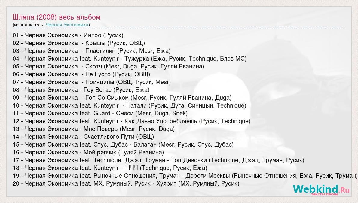 01 - Черная Экономика - Интро (Русик) 02 - Черная Экономика - Крышы (Русик, ОВЩ) 03 - Черная Экономика - Пластилин (Русик, Mesr, Ежа) 04 - Черная Экономика feat. Kunteynir - Тужурка (Ежа, Русик, Technique, Блев MC) 05 - Черная Экономика - Скотч (Mesr, Duga, Русик, Гуляй Рванина) 06 - Черная Экономика - Не Густо (Русик, ОВЩ) 07 - Черная Экономика - Принципы (ОВЩ, Русик, Mesr) 08 - Черная Экономика - Гоу Вегас (Русик, Ежа) 09 - Черная Экономика - Гоп Со Смыком (Мesr, Русик, Гуляй Рванина, Дuga) 10 - Черная Экономика feat. Kunteynir - Натали (Русик, Дуга, Синицын, Technique) 11 - Черная Экономика feat. Guard - Смеси (Mesr, Duga, Snek) 12 - Черная Экономика feat. Kunteynir - Как Давно Употребляешь (Русик, Technique) 13 - Черная Экономика - Мне Поверь (Mesr, Русик, Duga) 14 - Черная Экономика - Счастливого Пути (ОВЩ) 15 - Черная Экономика feat. Стус, Дубас - Балаган (Mesr, Русик, Стус, Дубас) 16 - Черная Экономика - Мой рэпчик (Гуляй Рванина) 17 - Черная Экономика feat. Technique, Джэд, Труман - Топ Девочки (Technique, Джэд, Труман, Русик) 18 - Черная Экономика feat. Kunteynir - ЧЧЧ (Technique, Русик, Ежа) 19 - Черная Экономика feat. Рыночные Отношения, Труман - Дороги Москвы (Рыночные Отношения, Ежа, Русик, Труман) 20 - Черная Экономика feat. МХ, Румяный, Русик - Хуярит (МХ, Румяный, Русик)