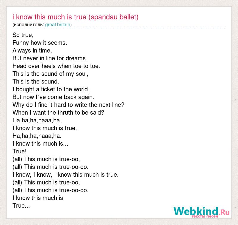 So true, Funny how it seems. Always in time, But never in line for dreams. Head over heels when toe to toe. This is the sound of my soul, This is the sound. I bought a ticket to the world, But now I`ve come back again. Why do I find it hard to write the next line? When I want the thruth to be said? Ha,ha,ha,haaa,ha. I know this much is true. Ha,ha,ha,haaa,ha. I know this much is... True! (all) This much is true-oo, (all) This much is true-oo-oo. I know, I know, I know this much is true. (all) This much is true-oo, (all) This much is true-oo-oo. I know this much is True...
