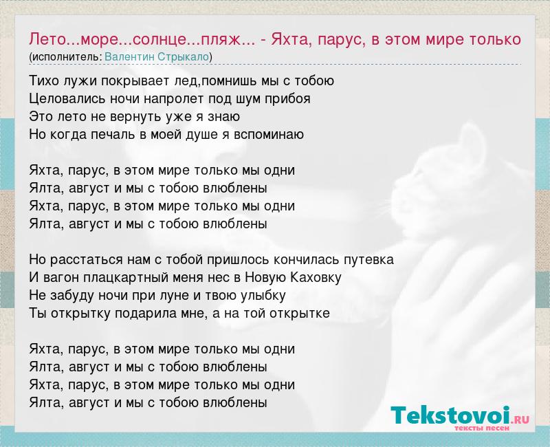 Тихо лужи покрывает лед,помнишь мы с тобою Целовались ночи напролет под шум прибоя Это лето не вернуть уже я знаю Но когда печаль в моей душе я вспоминаю Яхта, парус, в этом мире только мы одни Ялта, август и мы с тобою влюблены Яхта, парус, в этом мире только мы одни Ялта, август и мы с тобою влюблены Но расстаться нам с тобой пришлось кончилась путевка И вагон плацкартный меня нес в Новую Каховку Не забуду ночи при луне и твою улыбку Ты открытку подарила мне, а на той открытке Яхта, парус, в этом мире только мы одни Ялта, август и мы с тобою влюблены Яхта, парус, в этом мире только мы одни Ялта, август и мы с тобою влюблены