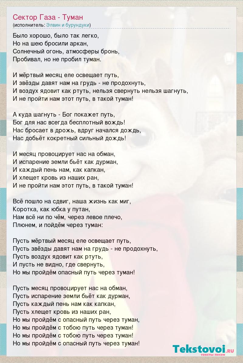 Было хорошо, было так легко, Но на шею бросили аркан, Солнечный огонь, атмосферы бронь, Пробивал, но не пробил туман. И мёртвый месяц еле освещает путь, И звёзды давят нам на грудь - не продохнуть, И воздух ядовит как ртуть, нельзя свернуть нельзя шагнуть, И не пройти нам этот путь, в такой туман! А куда шагнуть - Бог покажет путь, Бог для нас всегда бесплотный вождь! Нас бросает в дрожь, вдруг начался дождь, Нас добьёт кокретный сильный дождь! И месяц провоцирует нас на обман, И испарение земли бьёт как дурман, И каждый пень нам, как капкан, И хлещет кровь из наших ран, И не пройти нам этот путь, в такой туман! Всё пошло на сдвиг, наша жизнь как миг, Коротка, как юбка у путан, Нам всё ни по чём, через левое плечо, Плюнем, и пойдём через туман: Пусть мёртвый месяц еле освещает путь, Пусть звёзды давят нам на грудь - не продохнуть, Пусть воздух ядовит как ртуть, И пусть не видно, где свернуть, Но мы пройдём опасный путь через туман! Пусть месяц провоцирует нас на обман, Пусть испарение земли бьёт как дурман, Пусть каждый пень нам как капкан, Пусть хлещет кровь из наших ран, Но мы пройдём с опасный путь через туман, Но мы пройдём с тобою путь через туман! Но мы пройдём с тобою путь через туман! Но мы пройдём с опасный путь через туман!