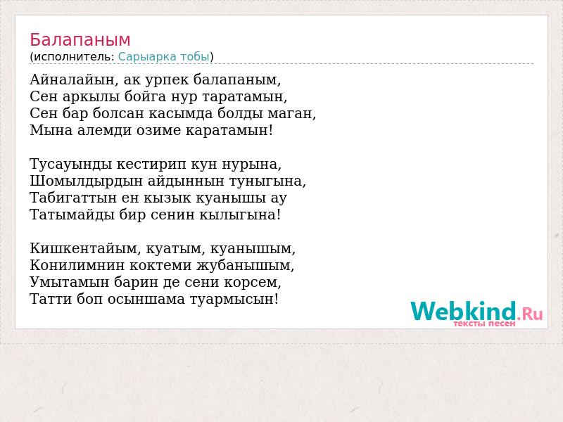 Айналайын, ак урпек балапаным, Сен аркылы бойга нур таратамын, Сен бар болсан касымда болды маган, Мына алемди озиме каратамын! Тусауынды кестирип кун нурына, Шомылдырдын айдыннын туныгына, Табигаттын ен кызык куанышы ау Татымайды бир сенин кылыгына! Кишкентайым, куатым, куанышым, Конилимнин коктеми жубанышым, Умытамын барин де сени корсем, Татти боп осыншама туармысын!