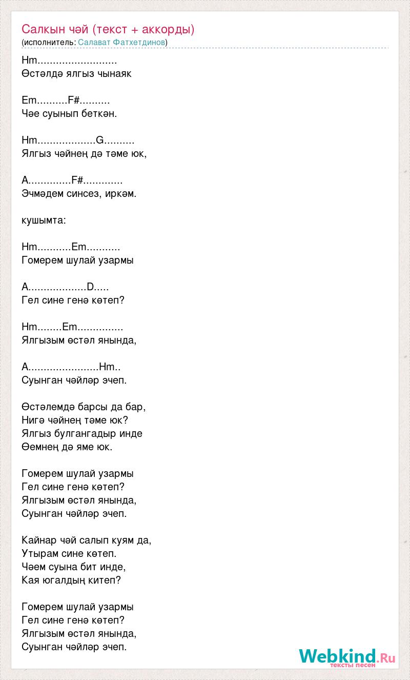 Hm.......................... Өстәлдә ялгыз чынаяк Em..........F#.......... Чәе суынып беткән. Hm...................G.......... Ялгыз чәйнең дә тәме юк, A..............F#............. Эчмәдем синсез, иркәм. кушымта: Hm...........Em........... Гомерем шулай узармы A...................D..... Гел сине генә көтеп? Hm........Em............... Ялгызым өстәл янында, A.......................Hm.. Суынган чәйләр эчеп. Өстәлемдә барсы да бар, Нигә чәйнең тәме юк? Ялгыз булгангадыр инде Өемнең дә яме юк. Гомерем шулай узармы Гел сине генә көтеп? Ялгызым өстәл янында, Суынган чәйләр эчеп. Кайнар чәй салып куям да, Утырам сине көтеп. Чәем суына бит инде, Кая югалдың китеп? Гомерем шулай узармы Гел сине генә көтеп? Ялгызым өстәл янында, Суынган чәйләр эчеп.