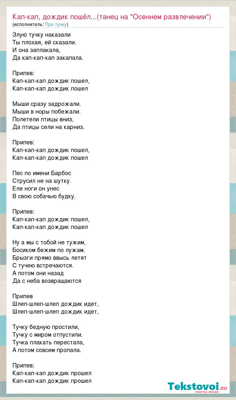 Злую тучку наказали Ты плохая, ей сказали. И она заплакала, Да кап-кап-кап закапала. Припев: Кап-кап-кап дождик пошел, Кап-кап-кап дождик пошел Мыши сразу задрожали. Мыши в норы побежали. Полетели птицы вниз, Да птицы сели на карниз. Припев: Кап-кап-кап дождик пошел, Кап-кап-кап дождик пошел Пес по имени Барбос Струсил не на шутку. Еле ноги он унес В свою собачью будку. Припев: Кап-кап-кап дождик пошел, Кап-кап-кап дождик пошел Ну а мы с тобой не тужим, Босиком бежим по лужам. Брызги прямо ввысь летят С тучею встречаются. А потом они назад Да с неба возвращаются Припев Шлеп-шлеп-шлеп дождик идет, Шлеп-шлеп-шлеп дождик идет, Тучку бедную простили, Тучку с миром отпустили. Тучка плакать перестала, А потом совсем пропала. Припев: Кап-кап-кап дождик прошел Кап-кап-кап дождик прошел