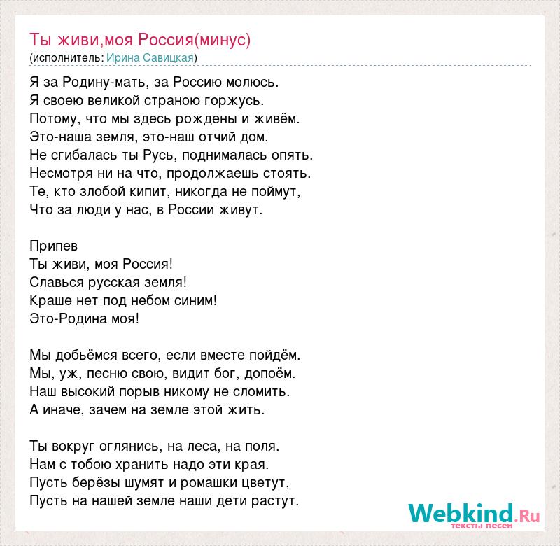 Я за Родину-мать, за Россию молюсь. Я своею великой страною горжусь. Потому, что мы здесь рождены и живём. Это-наша земля, это-наш отчий дом. Не сгибалась ты Русь, поднималась опять. Несмотря ни на что, продолжаешь стоять. Те, кто злобой кипит, никогда не поймут, Что за люди у нас, в России живут. Припев Ты живи, моя Россия! Славься русская земля! Краше нет под небом синим! Это-Родина моя! Мы добьёмся всего, если вместе пойдём. Мы, уж, песню свою, видит бог, допоём. Наш высокий порыв никому не сломить. А иначе, зачем на земле этой жить. Ты вокруг оглянись, на леса, на поля. Нам с тобою хранить надо эти края. Пусть берёзы шумят и ромашки цветут, Пусть на нашей земле наши дети растут.