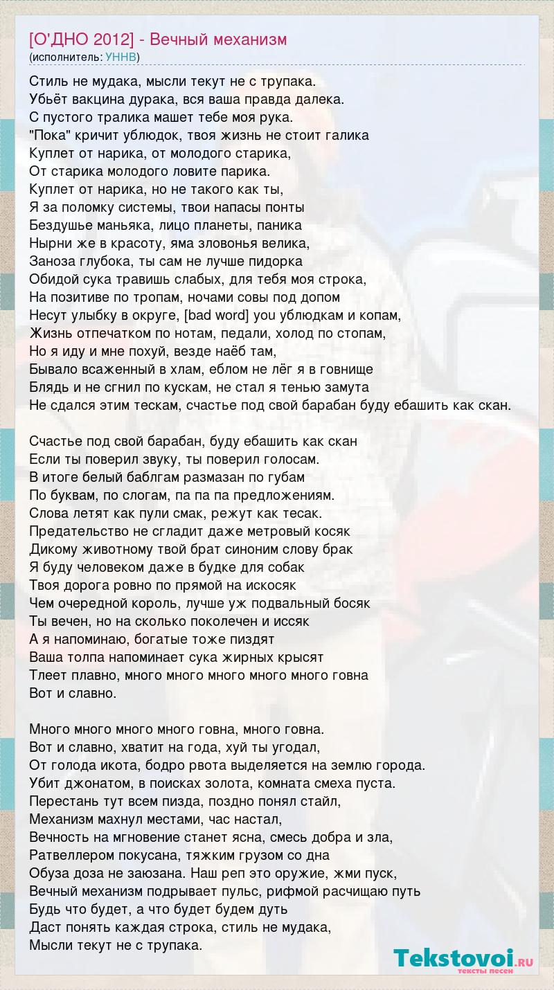 Стиль не мудака, мысли текут не с трупака. Убьёт вакцина дурака, вся ваша правда далека. С пустого тралика машет тебе моя рука. "Пока" кричит ублюдок, твоя жизнь не стоит галика Куплет от нарика, от молодого старика, От старика молодого ловите парика. Куплет от нарика, но не такого как ты, Я за поломку системы, твои напасы понты Бездушье маньяка, лицо планеты, паника Нырни же в красоту, яма зловонья велика, Заноза глубока, ты сам не лучше пидорка Обидой сука травишь слабых, для тебя моя строка, На позитиве по тропам, ночами совы под допом Несут улыбку в округе, [bad word] you ублюдкам и копам, Жизнь отпечатком по нотам, педали, холод по стопам, Но я иду и мне похуй, везде наёб там, Бывало всаженный в хлам, еблом не лёг я в говнище Блядь и не сгнил по кускам, не стал я тенью замута Не сдался этим тескам, счастье под свой барабан буду ебашить как скан. Счастье под свой барабан, буду ебашить как скан Если ты поверил звуку, ты поверил голосам. В итоге белый баблгам размазан по губам По буквам, по слогам, па па па предложениям. Слова летят как пули смак, режут как тесак. Предательство не сгладит даже метровый косяк Дикому животному твой брат синоним слову брак Я буду человеком даже в будке для собак Твоя дорога ровно по прямой на искосяк Чем очередной король, лучше уж подвальный босяк Ты вечен, но на сколько поколечен и иссяк А я напоминаю, богатые тоже пиздят Ваша толпа напоминает сука жирных крысят Тлеет плавно, много много много много много говна Вот и славно. Много много много много говна, много говна. Вот и славно, хватит на года, хуй ты угодал, От голода икота, бодро рвота выделяется на землю города. Убит джонатом, в поисках золота, комната смеха пуста. Перестань тут всем пизда, поздно понял стайл, Механизм махнул местами, час настал, Вечность на мгновение станет ясна, смесь добра и зла, Ратвеллером покусана, тяжким грузом со дна Обуза доза не заюзана. Наш реп это оружие, жми пуск, Вечный механизм подрывает пульс, рифмой расчищаю путь Будь что будет, а что будет будем дуть Даст понять каждая строка, стиль не мудака, Мысли текут не с трупака.
