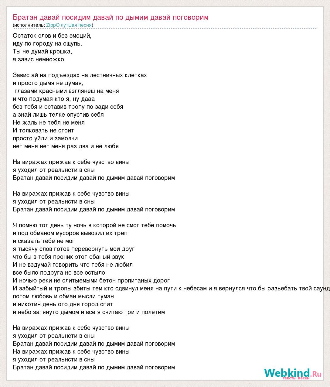 Остаток слов и без эмоций, иду по городу на ощупь. Ты не думай крошка, я завис немножко. Завис ай на подъездах на лестничных клетках и просто дымя не думая, глазами красными взглянеш на меня и что подумая кто я, ну дааа без тебя и оставив тропу по зади себя а знай лишь телке опустив себя Не жаль не тебя не меня И толковать не стоит просто уйди и замолчи нет меня нет меня раз два и не любя На виражах прижав к себе чувство вины я уходил от реальнсти в сны Братан давай посидим давай по дымим давай поговорим На виражах прижав к себе чувство вины я уходил от реальнсти в сны Братан давай посидим давай по дымим давай поговорим Я помню тот день ту ночь в которой не смог тебе помочь и под обманом мусоров вывозил их треп и сказать тебе не мог я тысячу слов готов перевернуть мой друг что бы в тебя проник этот ебаный звук И не вздумай говорить что тебя не любил все было подруга но все остыло И ночью реки не слитыемыми бетон пропитаных дорог И забыйтый и тропы збиты тем кто сдвинул меня на пути к небесам и я вернулся что бы разьебать твой саунд потом любовь и обман мысли туман и никотин день ото дня город спит и небо затянуто дымом и все я считаю три и полетим На виражах прижав к себе чувство вины я уходил от реальнсти в сны Братан давай посидим давай по дымим давай поговорим На виражах прижав к себе чувство вины я уходил от реальнсти в сны Братан давай посидим давай по дымим давай поговорим