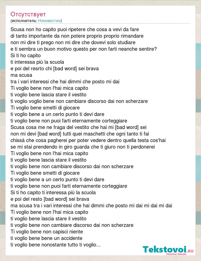 Scusa non ho capito puoi ripetere che cosa a vevi da fare di tanto importante da non potere proprio proprio rimandare non mi dire ti prego non mi dire che dovevi solo studiare e ti sembra un buon motivo questo per non farti neanche sentire? Si ti ho capito ti interessa più la scuola e poi del resrto chi [bad word] sei brava ma scusa tra i vari interessi che hai dimmi che posto mi dai Ti voglio bene non l'hai mica capito ti voglio bene lascia stare il vestito ti voglio voglio bene non cambiare discorso dai non scherzare Ti voglio bene smetti di giocare ti voglio bene a un certo punto ti devi dare ti voglio bene non puoi farti eternamente corteggiare Scusa cosa me ne fraga del vestito che hai mi [bad word] sei non mi devi [bad word] tutti quei maschetti che ogni tanto ti fai chissà che cosa pagherei per poter vedere dentro quella testa cos'hai se mi stai prendendo in giro guarda che ti giuro non ti perdonerei Ti voglio bene non l'hai mica capito ti voglio bene lascia stare il vestito ti voglio bene non cambiare discorso dai non scherzare Ti voglio bene smetti di giocare ti voglio bene a un certo punto ti devi dare ti voglio bene non puoi farti eternamente corteggiare Si ti ho capito ti interessa più la scuola e poi del resto [bad word] sei brava ma scusa tra i vari interessi che hai dimmi che posto mi dai mi dai mi dai Ti voglio bene non l'hai mica capito ti voglio bene lascia stare il vestito ti voglio bene non cambiare discorso dai non scherzare Ti voglio bene non capisci niente ti voglio bene bene un accidente ti voglio bene nonostante tutto ti voglio...