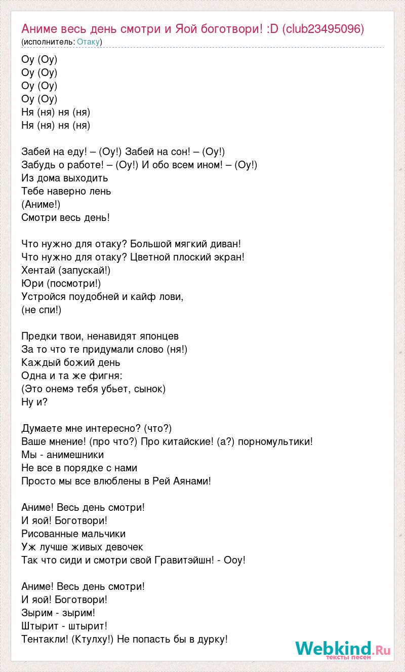 Оу (Оу) Оу (Оу) Оу (Оу) Оу (Оу) Ня (ня) ня (ня) Ня (ня) ня (ня) Забей на еду! – (Оу!) Забей на сон! – (Оу!) Забудь о работе! – (Оу!) И обо всем ином! – (Оу!) Из дома выходить Тебе наверно лень (Аниме!) Смотри весь день! Что нужно для отаку? Большой мягкий диван! Что нужно для отаку? Цветной плоский экран! Хентай (запускай!) Юри (посмотри!) Устройся поудобней и кайф лови, (не спи!) Предки твои, ненавидят японцев За то что те придумали слово (ня!) Каждый божий день Одна и та же фигня: (Это онемэ тебя убьет, сынок) Ну и? Думаете мне интересно? (что?) Ваше мнение! (про что?) Про китайские! (а?) порномультики! Мы - анимешники Не все в порядке с нами Просто мы все влюблены в Рей Аянами! Аниме! Весь день смотри! И яой! Боготвори! Рисованные мальчики Уж лучше живых девочек Так что сиди и смотри свой Гравитэйшн! - Ооу! Аниме! Весь день смотри! И яой! Боготвори! Зырим - зырим! Штырит - штырит! Тентакли! (Ктулху!) Не попасть бы в дурку!