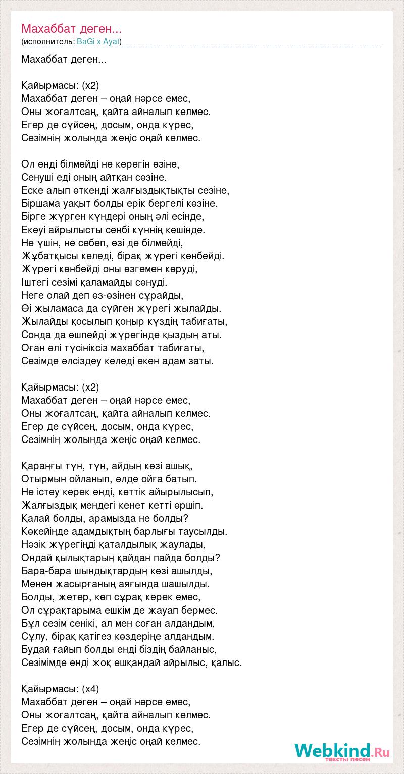 Махаббат деген... Қайырмасы: (х2) Махаббат деген – оңай нәрсе емес, Оны жоғалтсаң, қайта айналып келмес. Егер де сүйсең, досым, онда күрес, Сезімнің жолында жеңіс оңай келмес. Ол енді білмейді не керегін өзіне, Сенуші еді оның айтқан сөзіне. Еске алып өткенді жалғыздықтықты сезіне, Біршама уақыт болды ерік бергелі көзіне. Бірге жүрген күндері оның әлі есінде, Екеуі айрылысты сенбі күннің кешінде. Не үшін, не себеп, өзі де білмейді, Жұбатқысы келеді, бірақ жүрегі көнбейді. Жүрегі көнбейді оны өзгемен көруді, Іштегі сезімі қаламайды сөнуді. Неге олай деп өз-өзінен сұрайды, Өі жыламаса да сүйген жүрегі жылайды. Жылайды қосылып қоңыр күздің табиғаты, Сонда да өшпейді жүрегінде қыздың аты. Оған әлі түсініксіз махаббат табиғаты, Сезімде әлсіздеу келеді екен адам заты. Қайырмасы: (х2) Махаббат деген – оңай нәрсе емес, Оны жоғалтсаң, қайта айналып келмес. Егер де сүйсең, досым, онда күрес, Сезімнің жолында жеңіс оңай келмес. Қараңғы түн, түн, айдың көзі ашық, Отырмын ойланып, әлде ойға батып. Не істеу керек енді, кеттік айырылысып, Жалғыздық мендегі кенет кетті өршіп. Қалай болды, арамызда не болды? Көкейіңде адамдықтың барлығы таусылды. Нәзік жүрегіңді қаталдылық жаулады, Ондай қылықтарың қайдан пайда болды? Бара-бара шындықтардың көзі ашылды, Менен жасырғаның аяғында шашылды. Болды, жетер, көп сұрақ керек емес, Ол сұрақтарыма ешкім де жауап бермес. Бұл сезім сенікі, ал мен соған алдандым, Сұлу, бірақ қатігез көздеріңе алдандым. Будай ғайып болды енді біздің байланыс, Сезімімде енді жоқ ешқандай айрылыс, қалыс. Қайырмасы: (х4) Махаббат деген – оңай нәрсе емес, Оны жоғалтсаң, қайта айналып келмес. Егер де сүйсең, досым, онда күрес, Сезімнің жолында жеңіс оңай келмес.