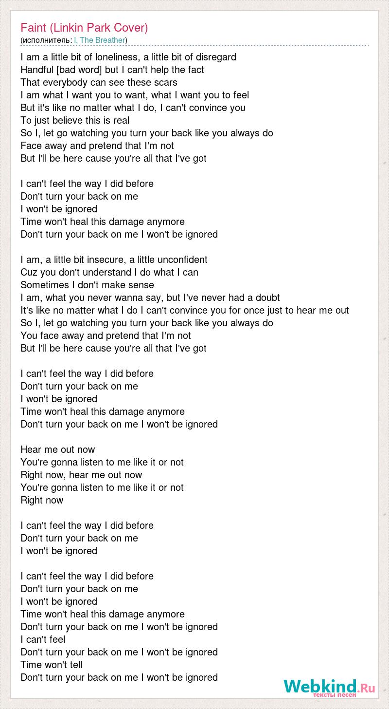 I am a little bit of loneliness, a little bit of disregard Handful [bad word] but I can't help the fact That everybody can see these scars I am what I want you to want, what I want you to feel But it's like no matter what I do, I can't convince you To just believe this is real So I, let go watching you turn your back like you always do Face away and pretend that I'm not But I'll be here cause you're all that I've got I can't feel the way I did before Don't turn your back on me I won't be ignored Time won't heal this damage anymore Don't turn your back on me I won't be ignored I am, a little bit insecure, a little unconfident Cuz you don't understand I do what I can Sometimes I don't make sense I am, what you never wanna say, but I've never had a doubt It's like no matter what I do I can't convince you for once just to hear me out So I, let go watching you turn your back like you always do You face away and pretend that I'm not But I'll be here cause you're all that I've got I can't feel the way I did before Don't turn your back on me I won't be ignored Time won't heal this damage anymore Don't turn your back on me I won't be ignored Hear me out now You're gonna listen to me like it or not Right now, hear me out now You're gonna listen to me like it or not Right now I can't feel the way I did before Don't turn your back on me I won't be ignored I can't feel the way I did before Don't turn your back on me I won't be ignored Time won't heal this damage anymore Don't turn your back on me I won't be ignored I can't feel Don't turn your back on me I won't be ignored Time won't tell Don't turn your back on me I won't be ignored