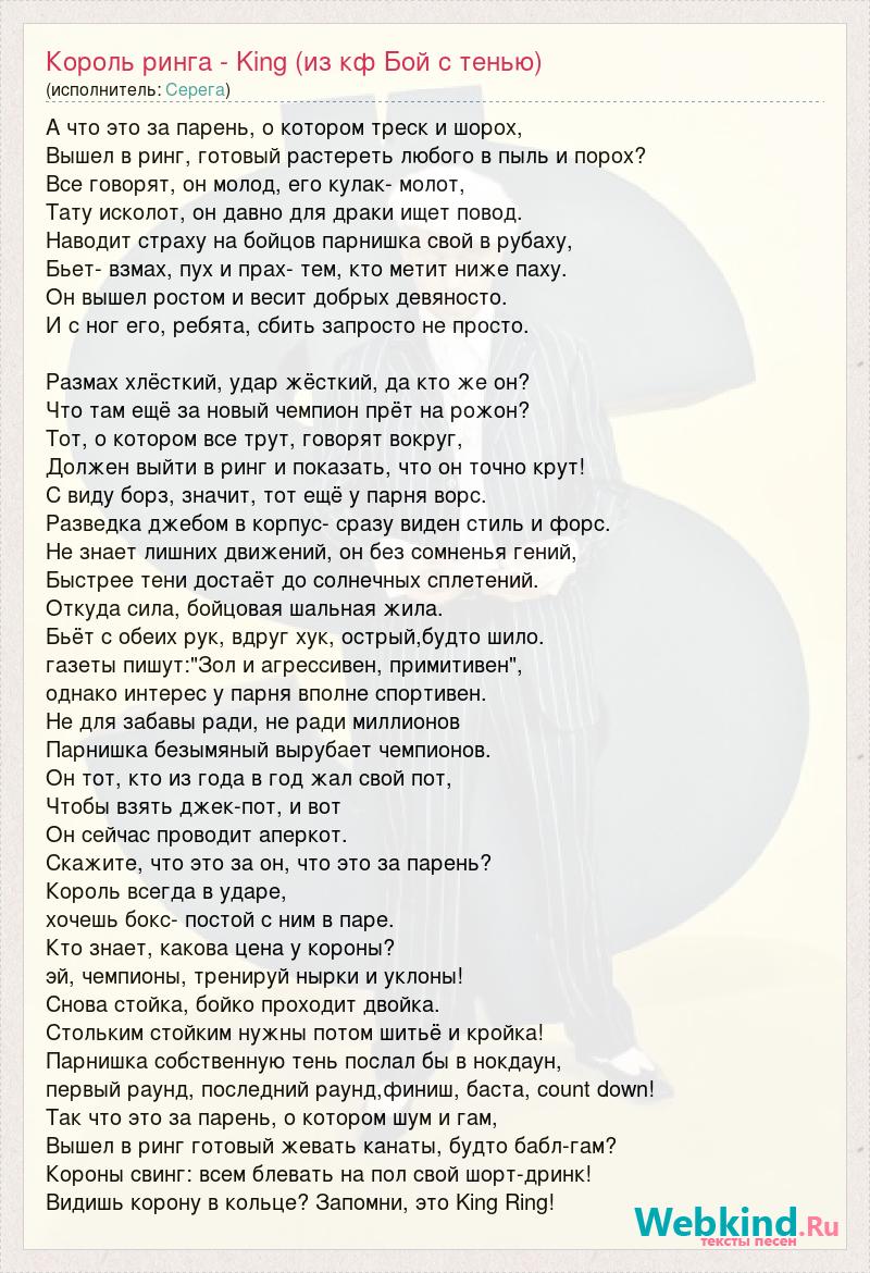 А что это за парень, о котором треск и шорох, Вышел в ринг, готовый растереть любого в пыль и порох? Все говорят, он молод, его кулак- молот, Тату исколот, он давно для драки ищет повод. Наводит страху на бойцов парнишка свой в рубаху, Бьет- взмах, пух и прах- тем, кто метит ниже паху. Он вышел ростом и весит добрых девяносто. И с ног его, ребята, сбить запросто не просто. Размах хлёсткий, удар жёсткий, да кто же он? Что там ещё за новый чемпион прёт на рожон? Тот, о котором все трут, говорят вокруг, Должен выйти в ринг и показать, что он точно крут! С виду борз, значит, тот ещё у парня ворс. Разведка джебом в корпус- сразу виден стиль и форс. Не знает лишних движений, он без сомненья гений, Быстрее тени достаёт до солнечных сплетений. Откуда сила, бойцовая шальная жила. Бьёт с обеих рук, вдруг хук, острый,будто шило. газеты пишут:"Зол и агрессивен, примитивен", однако интерес у парня вполне спортивен. Не для забавы ради, не ради миллионов Парнишка безымяный вырубает чемпионов. Он тот, кто из года в год жал свой пот, Чтобы взять джек-пот, и вот Он сейчас проводит аперкот. Скажите, что это за он, что это за парень? Король всегда в ударе, хочешь бокс- постой с ним в паре. Кто знает, какова цена у короны? эй, чемпионы, тренируй нырки и уклоны! Снова стойка, бойко проходит двойка. Стольким стойким нужны потом шитьё и кройка! Парнишка собственную тень послал бы в нокдаун, первый раунд, последний раунд,финиш, баста, count down! Так что это за парень, о котором шум и гам, Вышел в ринг готовый жевать канаты, будто бабл-гам? Короны свинг: всем блевать на пол свой шорт-дринк! Видишь корону в кольце? Запомни, это King Ring!