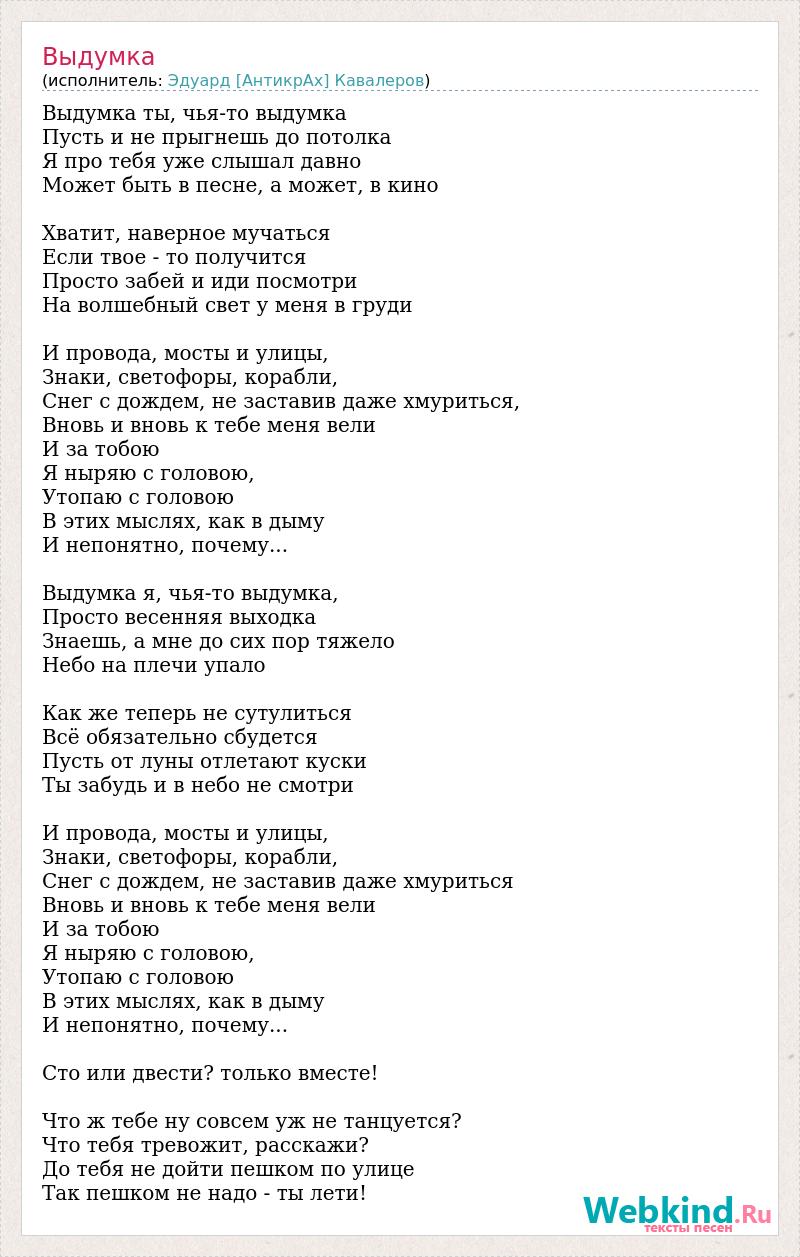 Выдумка ты, чья-то выдумка Пусть и не прыгнешь до потолка Я про тебя уже слышал давно Может быть в песне, а может, в кино Хватит, наверное мучаться Если твое - то получится Просто забей и иди посмотри На волшебный свет у меня в груди И провода, мосты и улицы, Знаки, светофоры, корабли, Снег с дождем, не заставив даже хмуриться, Вновь и вновь к тебе меня вели И за тобою Я ныряю с головою, Утопаю с головою В этих мыслях, как в дыму И непонятно, почему... Выдумка я, чья-то выдумка, Просто весенняя выходка Знаешь, а мне до сих пор тяжело Небо на плечи упало Как же теперь не сутулиться Всё обязательно сбудется Пусть от луны отлетают куски Ты забудь и в небо не смотри И провода, мосты и улицы, Знаки, светофоры, корабли, Снег с дождем, не заставив даже хмуриться Вновь и вновь к тебе меня вели И за тобою Я ныряю с головою, Утопаю с головою В этих мыслях, как в дыму И непонятно, почему... Сто или двести? только вместе! Что ж тебе ну совсем уж не танцуется? Что тебя тревожит, расскажи? До тебя не дойти пешком по улице Так пешком не надо - ты лети!