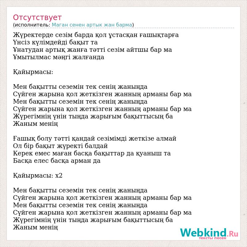 Жүректерде сезім барда қол ұстасқан ғашықтарға Үнсіз күлімдейді бақыт та Ұнатудан артық жанға тәтті сезім айтшы бар ма Ұмытылмас мәңгі жалғанда Қайырмасы: Мен бақытты сеземін тек сенің жаныңда Сүйген жарына қол жеткізген жанның арманы бар ма Мен бақытты сеземін тек сенің жаныңда Сүйген жарына қол жеткізген жанның арманы бар ма Жүрегімнің үнін тыңда жарығым бақыттысың ба Жаным менің Ғашық болу тәтті қандай сезімімді жеткізе алмай Ол бір бақыт жүректі балдай Керек емес маған басқа бақыттар да қуаныш та Басқа елес басқа арман да Қайырмасы: x2 Мен бақытты сеземін тек сенің жаныңда Сүйген жарына қол жеткізген жанның арманы бар ма Мен бақытты сеземін тек сенің жаныңда Сүйген жарына қол жеткізген жанның арманы бар ма Жүрегімнің үнін тыңда жарығым бақыттысың ба Жаным менің