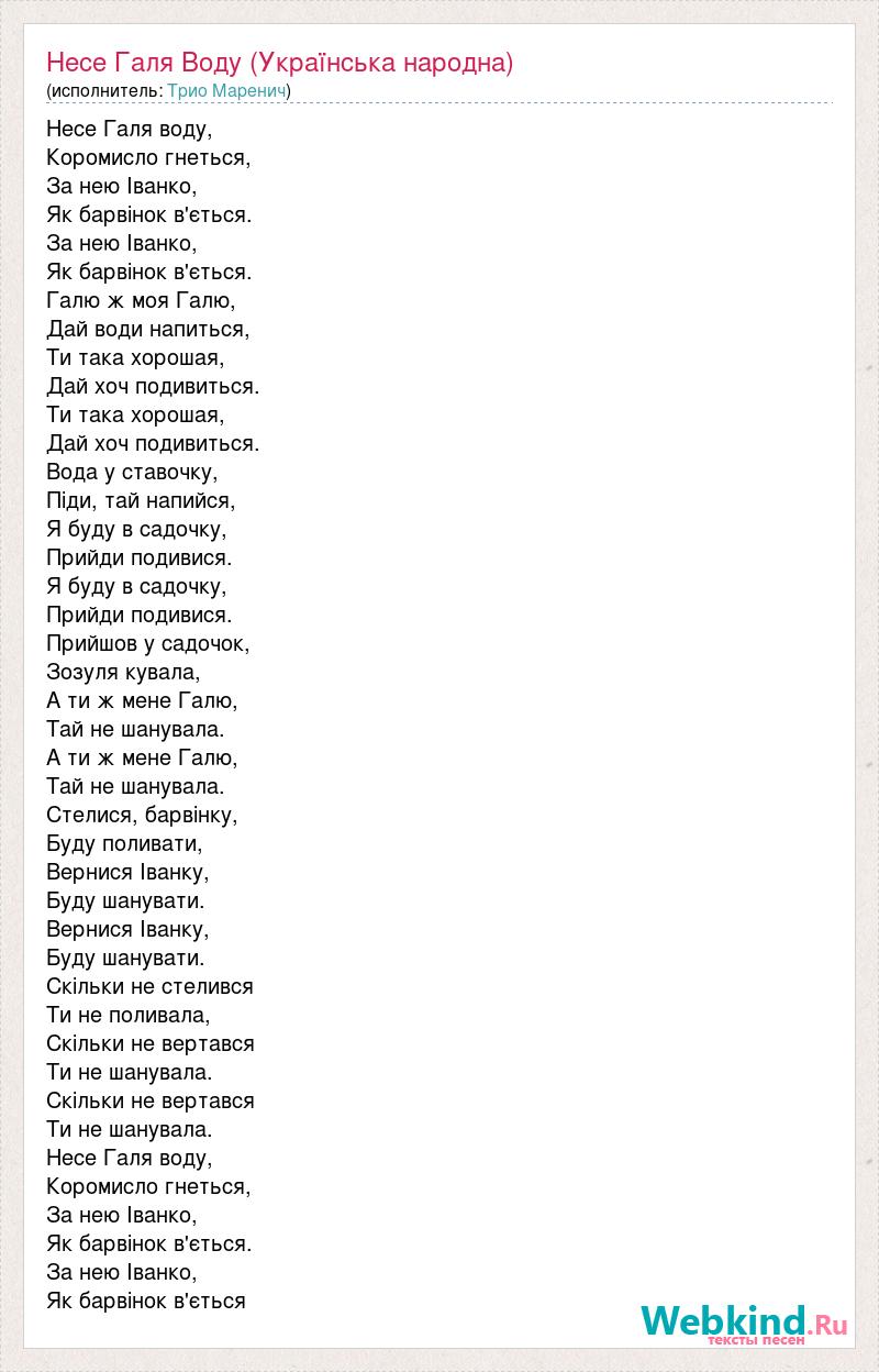 Несе Галя воду, Коромисло гнеться, За нею Іванко, Як барвінок в'ється. За нею Іванко, Як барвінок в'ється. Галю ж моя Галю, Дай води напиться, Ти така хорошая, Дай хоч подивиться. Ти така хорошая, Дай хоч подивиться. Вода у ставочку, Піди, тай напийся, Я буду в садочку, Прийди подивися. Я буду в садочку, Прийди подивися. Прийшов у садочок, Зозуля кувала, А ти ж мене Галю, Тай не шанувала. А ти ж мене Галю, Тай не шанувала. Стелися, барвінку, Буду поливати, Вернися Іванку, Буду шанувати. Вернися Іванку, Буду шанувати. Скільки не стелився Ти не поливала, Скільки не вертався Ти не шанувала. Скільки не вертався Ти не шанувала. Несе Галя воду, Коромисло гнеться, За нею Іванко, Як барвінок в'ється. За нею Іванко, Як барвінок в'ється