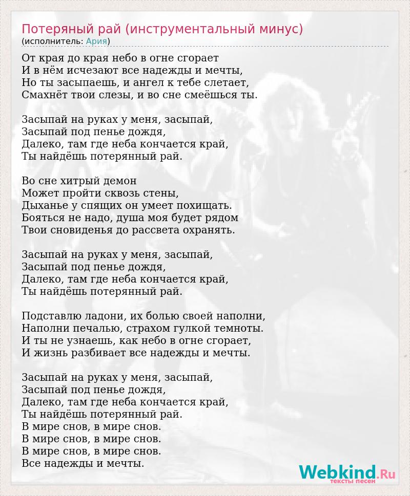 От края до края небо в огне сгорает И в нём исчезают все надежды и мечты, Но ты засыпаешь, и ангел к тебе слетает, Смахнёт твои слезы, и во сне смеёшься ты. 3асыпай на руках у меня, засыпай, Засыпай под пенье дождя, Далеко, там где неба кончается край, Ты найдёшь потерянный рай. Во сне хитрый демон Может пройти сквозь стены, Дыханье у спящих он умеет похищать. Бояться не надо, душа моя будет рядом Твои сновиденья до рассвета охранять. 3асыпай на руках у меня, засыпай, Засыпай под пенье дождя, Далеко, там где неба кончается край, Ты найдёшь потерянный рай. Подставлю ладони, их болью своей наполни, Наполни печалью, страхом гулкой темноты. И ты не узнаешь, как небо в огне сгорает, И жизнь разбивает все надежды и мечты. 3асыпай на руках у меня, засыпай, Засыпай под пенье дождя, Далеко, там где неба кончается край, Ты найдёшь потерянный рай. В мире снов, в мире снов. В мире снов, в мире снов. В мире снов, в мире снов. Все надежды и мечты.